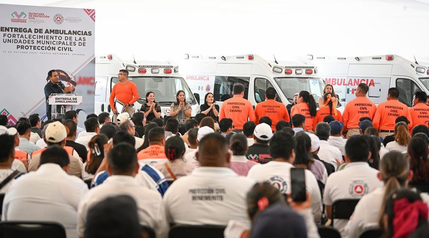 Tuxtla Gutiérrez, Chiapas; 27 de octubre de 2025.- Al encabezar la entrega de ambulancias para fortalecer las Unidades Municipales de Protección Civil, el gobernador Eduardo Ramírez Aguilar destacó que el gobierno de la Nueva ERA está comprometido con la seguridad y la salud del pueblo chiapaneco. Subrayó que la coordinación con los ayuntamientos ha sido clave para atender las necesidades más urgentes y obtener resultados en beneficio de la población.