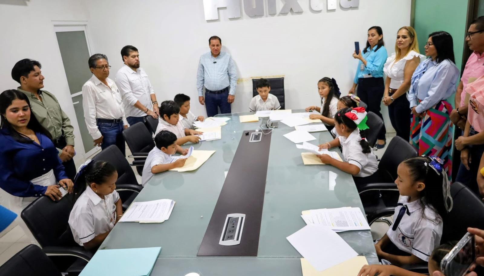 Huixtla, Chiapas; 07 de noviembre del 2025.- En la sede del Ayuntamiento Municipal de Huixtla, con la presencia de la mayoría de los integrantes del Cabildo, encabezados por el presidente municipal constitucional, Régulo Palomeque Sánchez, se instaló y realizó la sesión correspondiente al Cabildo Infantil 2025, representando a la escuela primaria Cuauhtémoc de esta ciudad.