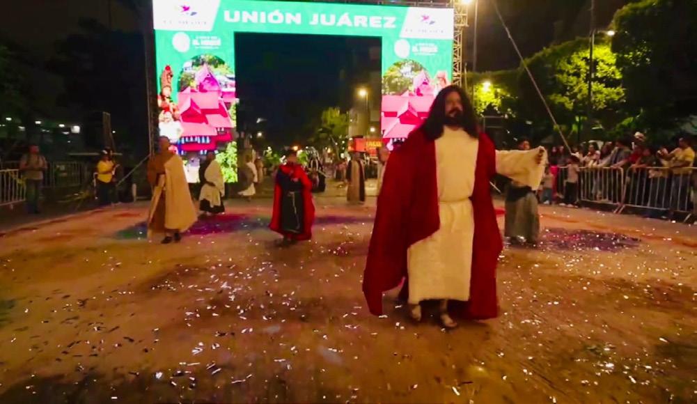 Tuxtla Gutiérrez, Chiapas; 17 de noviembre de 2025.- Con más de 74 años de la realización de la representación de la vida pasión y muerte de Jesucristo Unión Juárez se presentó ayer por la noche en el festival el MEQUE en la capital chiapaneca. Acompañado del gobernador Eduardo Ramírez Aguilar, el presidente municipal Fabián Barrios de León comentó que esta tradición es la máxima fiesta del municipio que duerme bajo las faldas del volcán Tacaná.