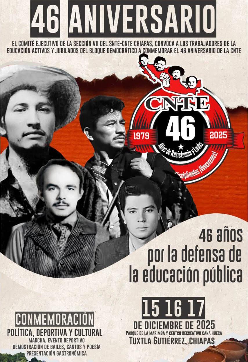 Tuxtla Gutiérrez, Chiapas; 17 de Noviembre del 2025.- El Comité Ejecutivo Seccional de la Sección VII del SNTE-CNTE convocó a los trabajadores de la Educación activos y jubilados a conmemorar los 46 años de la CNTE.