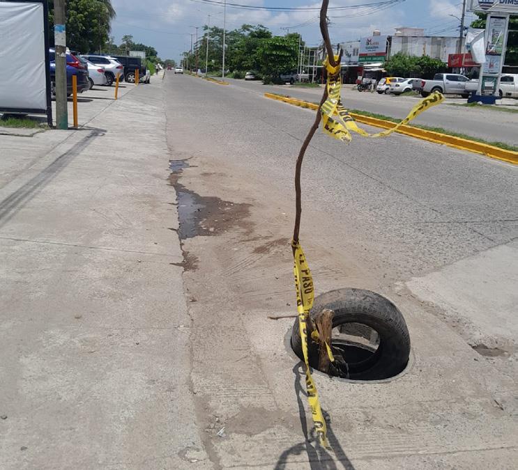 Las alcantarillas que se encuentran sin tapa en la ciudad representan un grave peligro tanto para peatones como para conductores de vehículos y motocicletas. Muchas personas han caído en esos agujeros y han sufrido lesiones, como hace unos días una señora que se lastimó la pierna y un brazo en pleno centro de la ciudad. Los vehículos y motocicletas sufren daños en la suspensión, y la reparación corre a cargo de los propietarios porque la autoridad simplemente hace caso omiso a su irresponsabilidad. P. 5 P. 6
