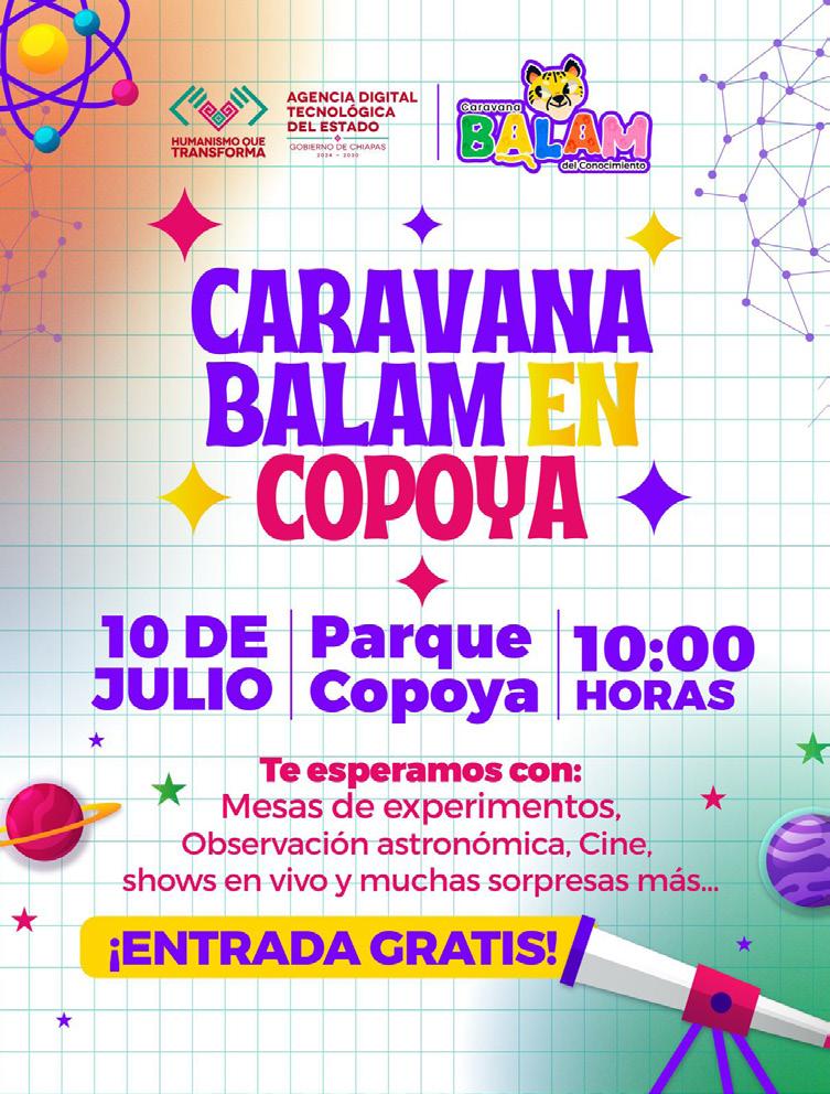 • No es solo un evento, es una experiencia para descubrir, convivir y dejarse asombrar Tuxtla Gutiérrez, Chiapas; 08 de julio de 2025.– El Parque Central de Copoya se transformará este jueves 10 de julio en un escenario de ciencia, arte y diversión con la llegada de la Caravana de ciencia y tecnología “Balam”, un evento gratuito diseñado para que niñas, niños, jóvenes y familias vivan una jornada inolvidable de