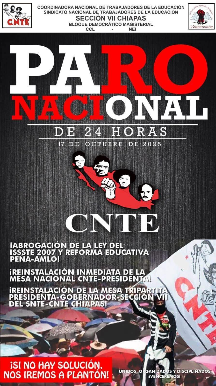 Bigvai Méndezcruz Cruz / Tucán Tuxtla Gutiérrez, Chiapas; 7 de octubre de 2025.– El Comité Ejecutivo Seccional de la Sección VII del SNTE-CNTE anunció un paro nacional de 24 horas para el próximo 17 de octubre, en cumplimiento de los acuerdos tomados durante la Asamblea Nacional Representativa de la CNTE, celebrada el pasado 3 de octubre.