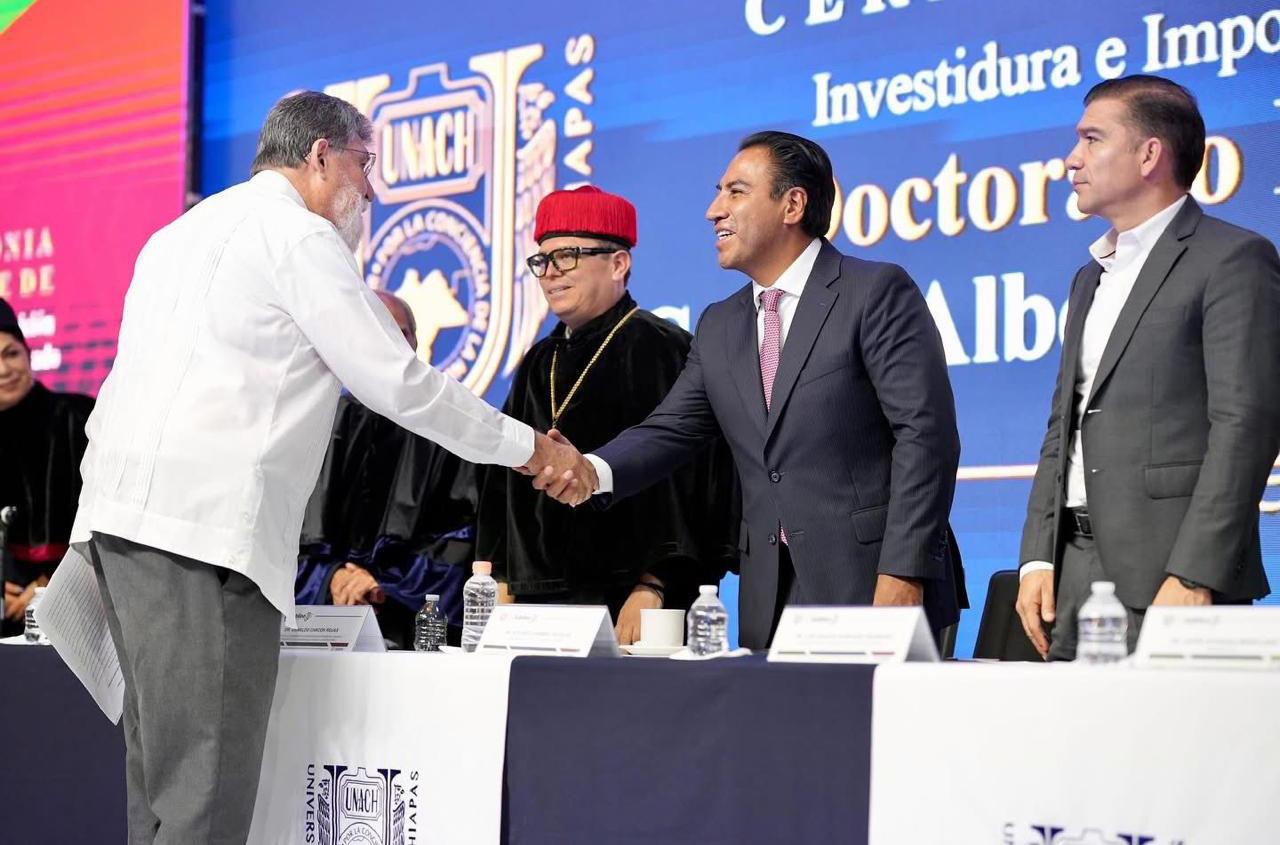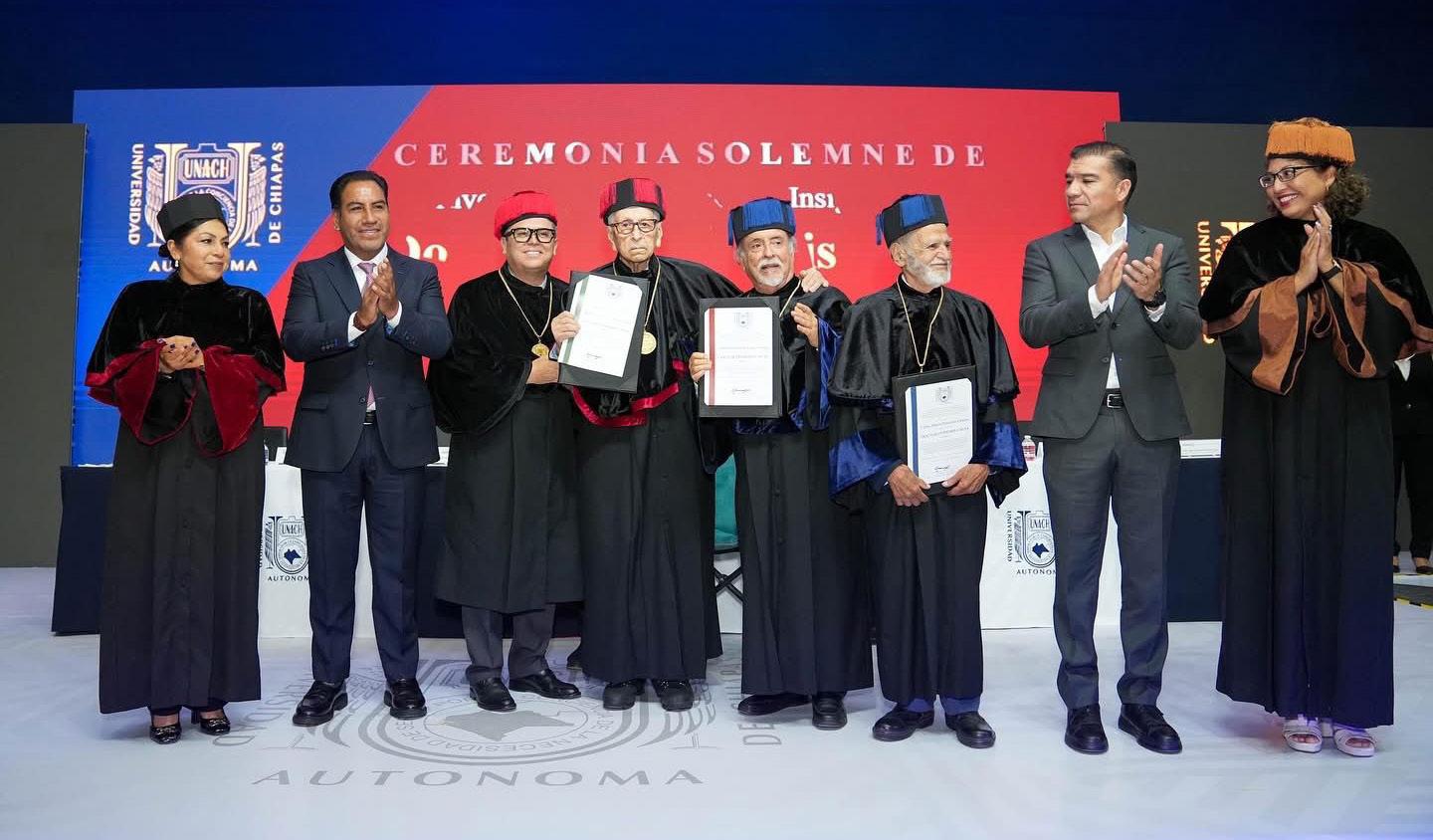 Tuxtla Gutiérrez, Chiapas; 25 de septiembre de 2025.- El gobernador Eduardo Ramírez Aguilar asistió a la ceremonia solemne de Investidura e Imposición de Insignias del Doctorado Honoris Causa que otorgó la Benemérita Universidad Autónoma de Chiapas (Unach) al profesor e investigador emérito del Instituto Nacional de Antropología e Historia (INAH), Antonio García de León y Griego; al arqueólogo y escritor guatemalteco, Carlos Alberto Navarrete Cáceres; y al historiador,
