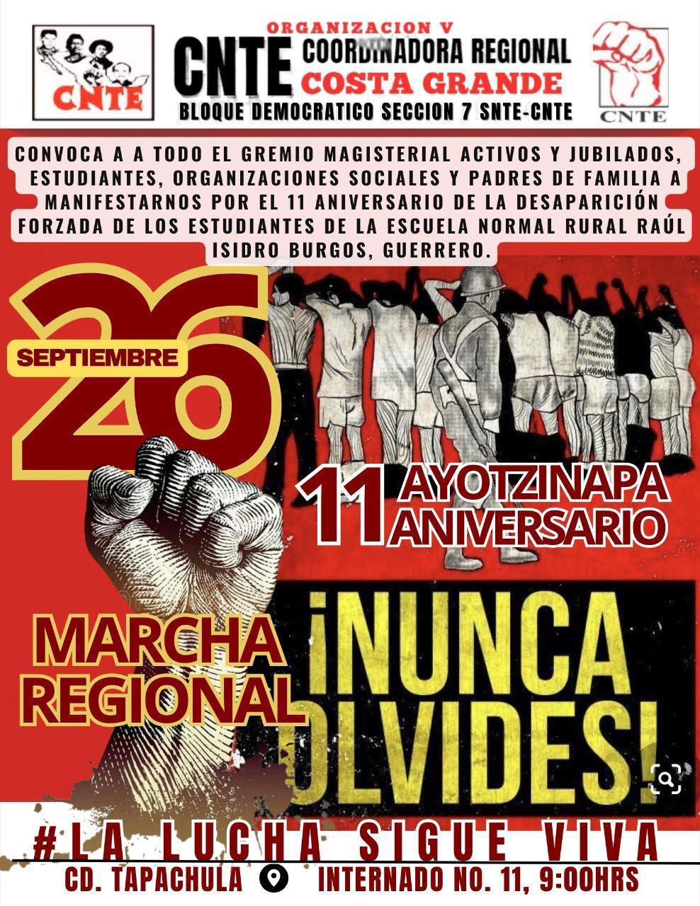 Mañana viernes 26 de septiembre del 2025, se cumplen 11 años de su desaparición y ante las promesas primero del priista Enrique Peña Nieto, del Morenista Andrés Manuel López Obrador y ahora a un año de gobierno de Claudia Sheinbaum de Morena, nadie ha aparecido ni muerto ni mucho menos vivo. Han sido 11 años de promesas incumplidas y de un estado fallido por encontrarlos muertos o vivos.