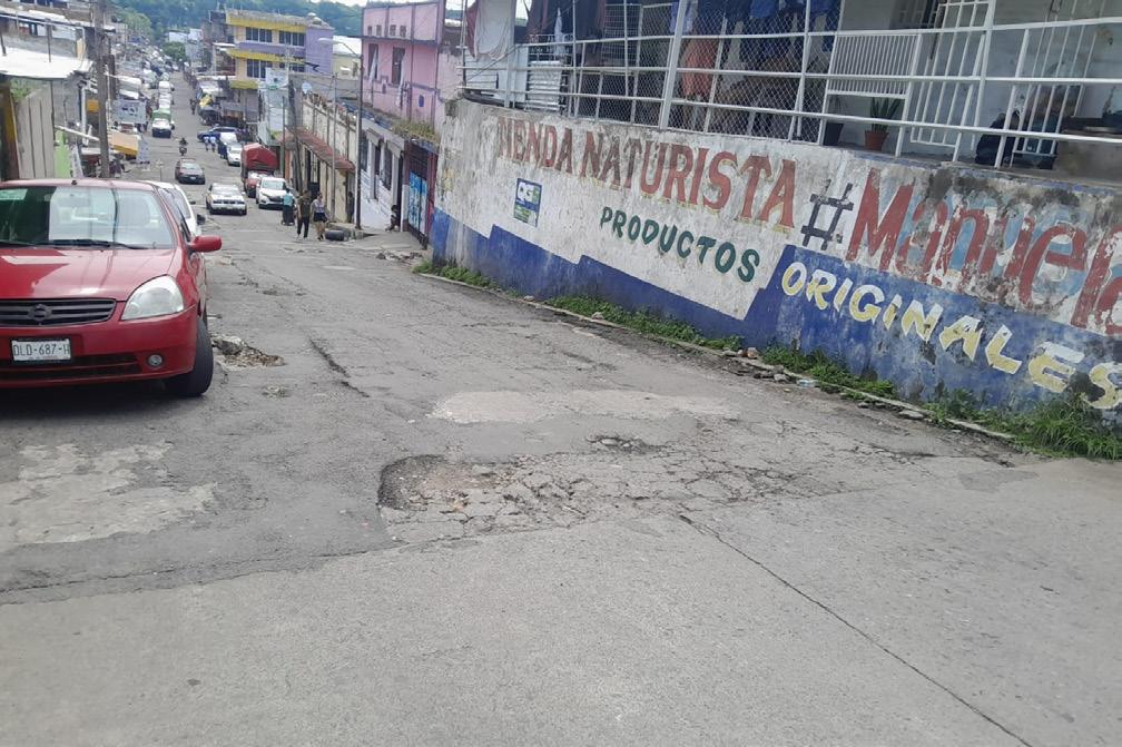 Tapachula, Chiapas, 15 de octubre de 2025.- Las calles del primer cuadro de la ciudad se encuentran intransitables por la falta de bacheo y genera molestia entre los comerciantes de la zona.