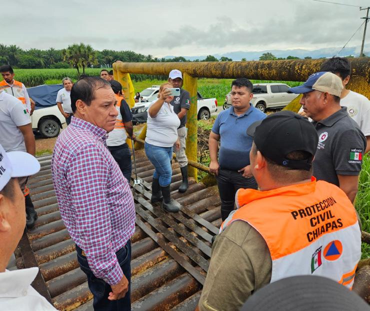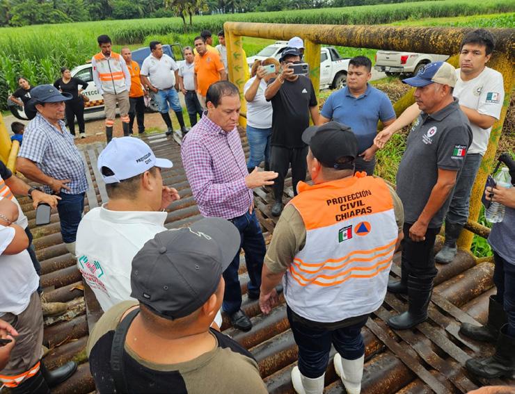 El presidente municipal de Huixtla, Regulo Palomeque Sánchez, y el alcalde de Huehuetán, Sixto López Pérez, se reunieron en la comunidad durante el recorrido por la zona baja de sus municipios, entre San Fernando y Lázaro Cárdenas en el puente de hamaca, para coordinar acciones de apoyo a las familias afectadas por las intensas lluvias.