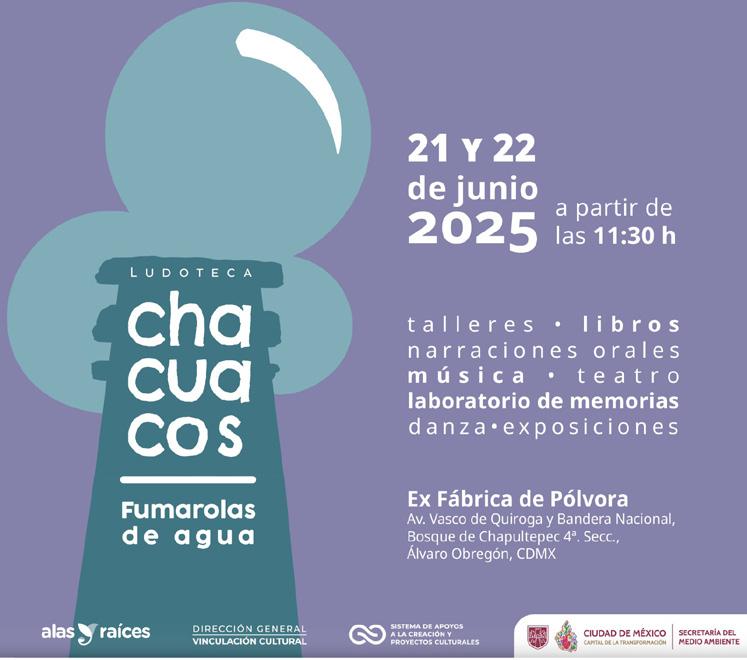 Bajo los principios del ejercicio pleno de los derechos culturales y ambientales, la Secretaría de Cultura del Gobierno de México, a través de la Dirección General de Vinculación Cultural, el Sistema Creación y la Coordinación Nacional de Desarrollo Cultural Infantil – Alas y Raíces, en colaboración con la Secretaría de Medio Ambiente (Sedema) del Gobierno de la Ciudad de México, arranca actividades, el próximo sábado 21 de junio de 2025, la Ludoteca “Chacuacos, fumarolas de agua”, que beneficia a la comunidad que habita y visita. la zona poniente de la capital del país.