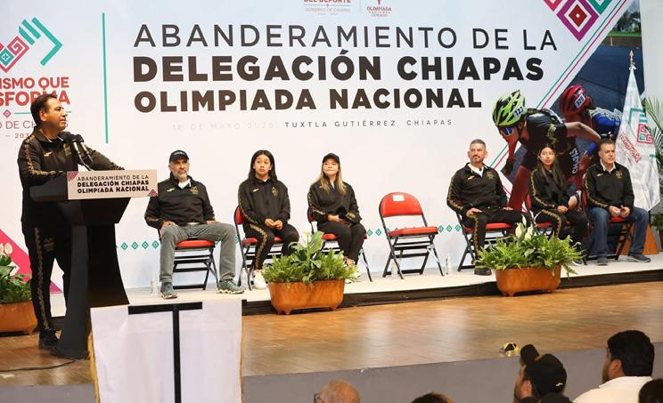 Tuxtla Gutiérrez, Chiapas; 19 de mayo de 2025.- El gobernador Eduardo Ramírez Aguilar encabezó el abanderamiento de la delegación chiapaneca que participará en la Olimpiada Nacional 2025, donde afirmó que, ahora que Chiapas vive en paz, comienza una Nueva ERA para el deporte, por lo que su gobierno impulsará las obras de infraestructura necesarias para que el estado vuelva a ser sede de este importante evento deportivo, después de muchos años.