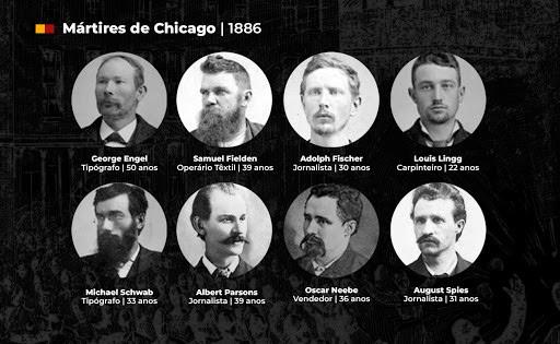 SUCESOS QUE CULMINARON CON LA TRAGEDIA DE CHICAGO, INICIADA EN MAYO DE 1886 Y EPILOGADA CON EL AHORCAMIENTO DE VARIOS DIRIGENTES SINDICALES ANARQUISTAS EL 11 DE NOVIEMBRE DE 1887, QUE DESDE ENTONCES SON CONOCIDOS MUNDIALMENTE COMO LOS MÁRTIRES DE CHICAGO. A ELLOS SE DEBE QUE LA CLASE PROLETARIA, DESPUÉS DE MUCHAS LUCHAS, DISFRUTE AHORA DE LA JORNADA MÁXIMA DE
