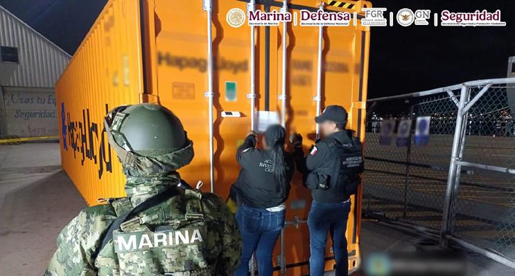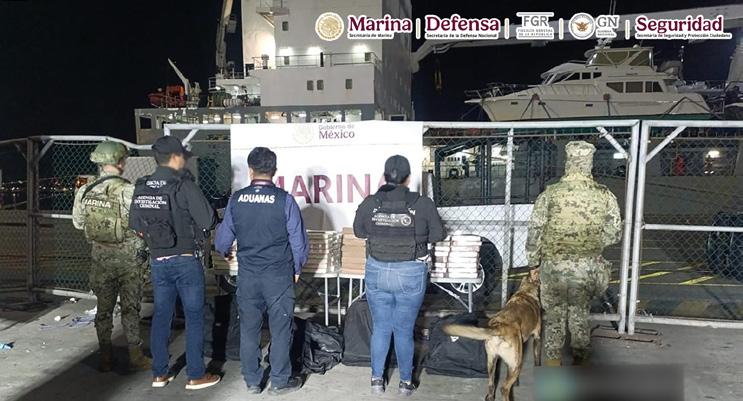 Ciudad de México; 04 de julio de 2025.- Como parte de las acciones para evitar el ingreso y trasiego de sustancias ilícitas, elementos de la Secretaría de Marina (Semar) a través de la Armada de México, en coordinación con Secretaría de la Defensa Nacional (Defensa), Fiscalía General de la República (FGR), Guardia Nacional (GN) y Secretaría de Seguridad y Protección Ciudadana (SSPC) aseguraron 188 paquetes con un peso aproximado de 200 kilos de cocaína, en las instalaciones de la Aduana de Ensenada, en Baja California. Esta acción se llevó a cabo durante recorridos de inspección y vigilancia con el apoyo de un ejemplar canino, al interior del recinto portuario, cuando se realizó la revisión de dos contenedores, mismos que fueron descargados de un buque, de los cuales, uno de ellos contenía cuatro maletas con los paquetes de cocaína. Por anterior, la droga asegurada fue puesta a disposición del agente del Ministerio Público correspondiente, a fin de integrar la carpeta de investigación del caso.