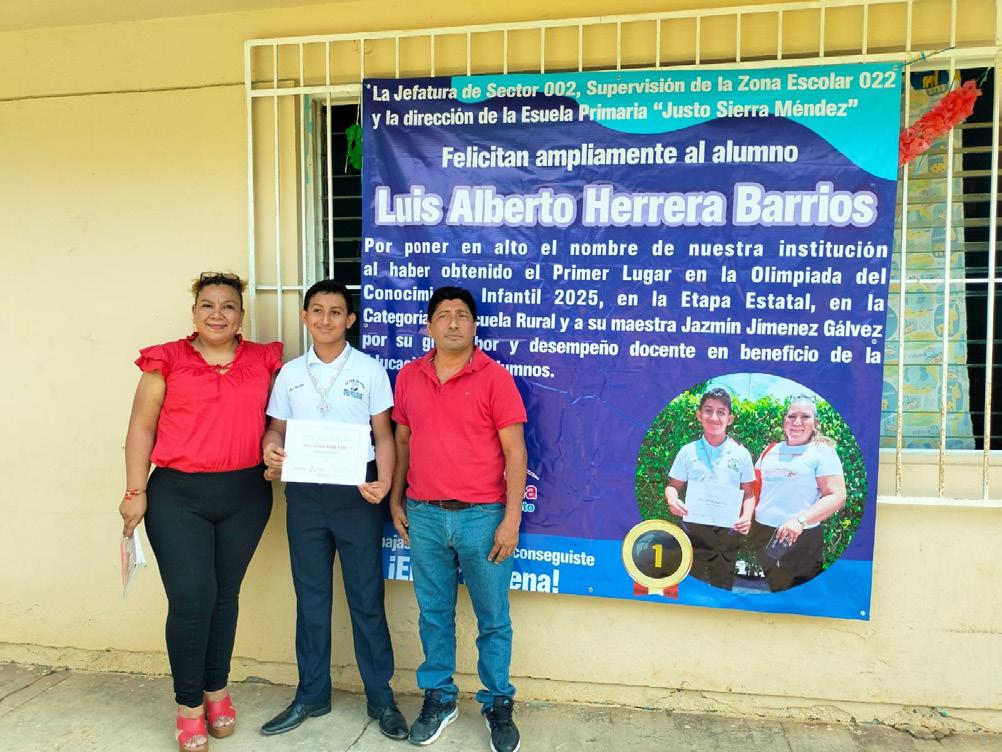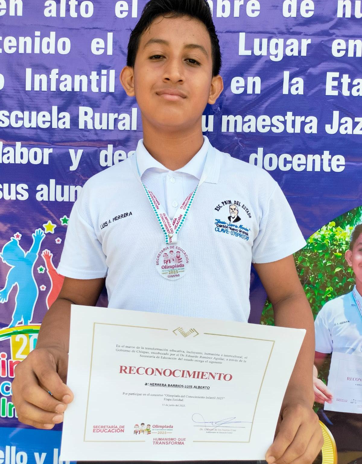 Tapachula, Chiapas; 04 de julio de 2025.- Luis Alberto Herrera Barrios alumno de 6to grado de la escuela primaria rural del estado Justo Sierra Méndez ubicada en el cantón Nueva Granada municipio de Tapachula, se convirtió en el ganador del primer lugar de la olimpiada del conocimiento infantil 2025 en su etapa estatal de escuelas rurales.