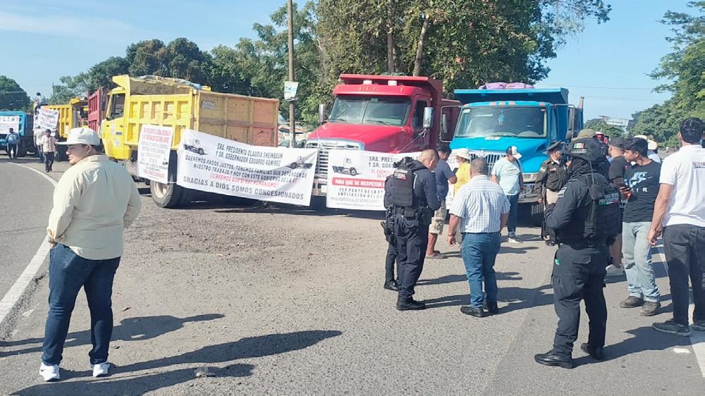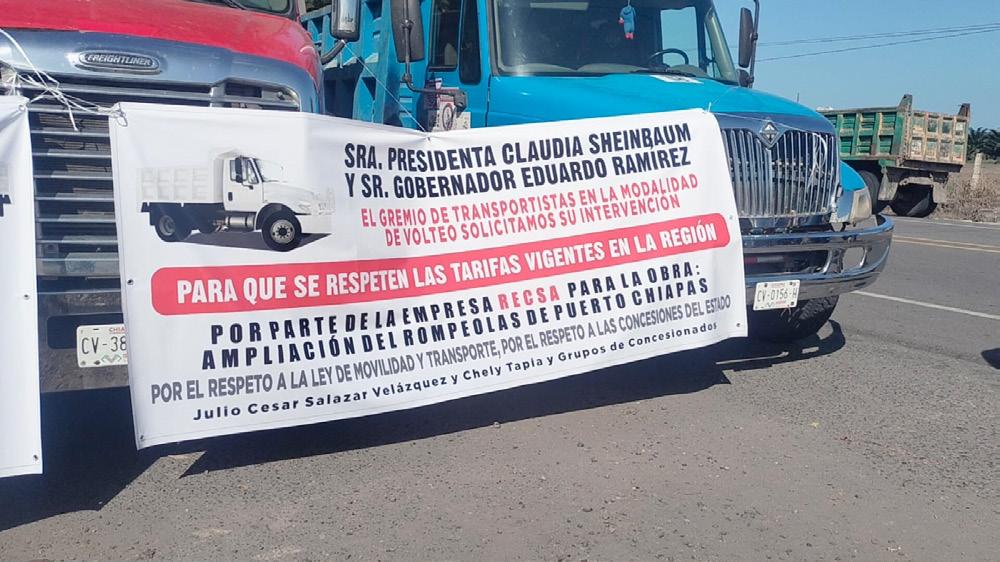 La mañana del jueves un grupo de transportistas de carga pesada en su modalidad de volteos pertenecientes a 24 organizaciones y sindicatos de la región se manifestaron pacíficamente en el tramo carretero Tapachula – Puerto Madero, como referencia a la altura de la entrada a Playa Linda, donde cerca de 300 volqueteros con lonas y sus unidades varadas fuera d la carretera pedían ser atendidos por las autoridades solicitando entre otras cosas el pago justo por los acarreos de material pétreo para la obra de la ampliación del rompeolas en Puerto Chiapas.