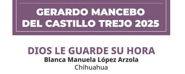 La Secretaría de Cultura del Gobierno de México, a través del Centro Cultural Helénico y la Compañía Nacional de Teatro, y el Fondo de Cultura Económica anuncian que Blanca Manuela López Arzola –escritora nacida en Chihuahua–es la ganadora del Premio Nacional de Dramaturgia Joven Gerardo Mancebo del Castillo Trejo 2025 por su obra: Dios le guarde su hora.