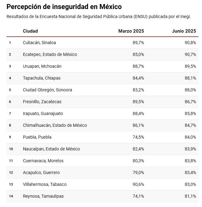 Destacó que esta percepción de inseguridad no es un invento de la gente, porque precisamente hoy jueves 24 de julio de 2025 ha sido divulgado un informe por el Instituto Nacional de Estadística y Geografía, sustentado en la Encuesta Nacional de Seguridad Pública Urbana (ENSU).