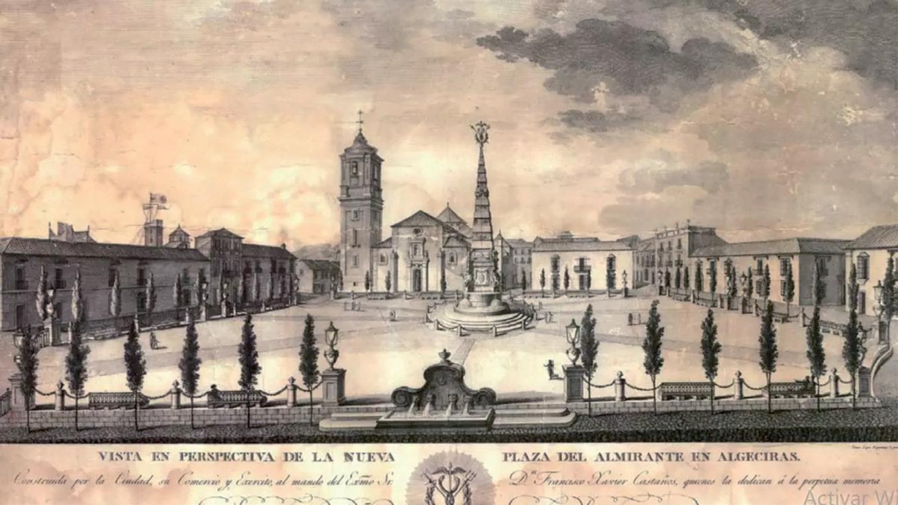 En este grabado de 1807 puede verse el obelisco en el cual el potente comercio de Algeciras hizo figurar una reveladora inscripción (Colección Viñas, Museo de Algeciras)