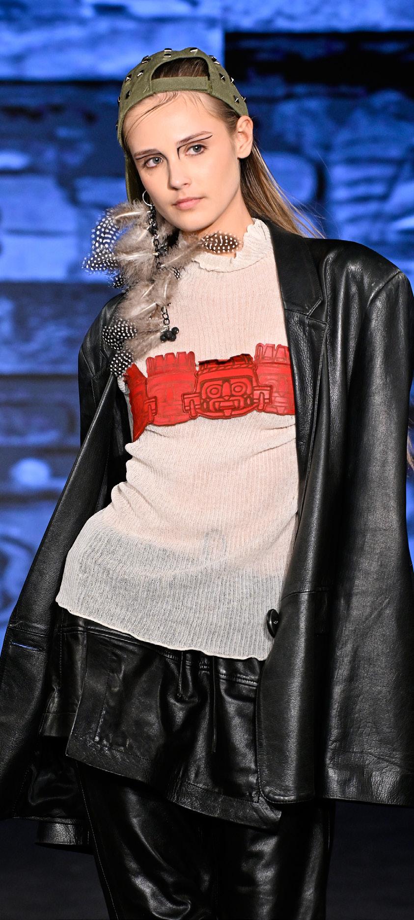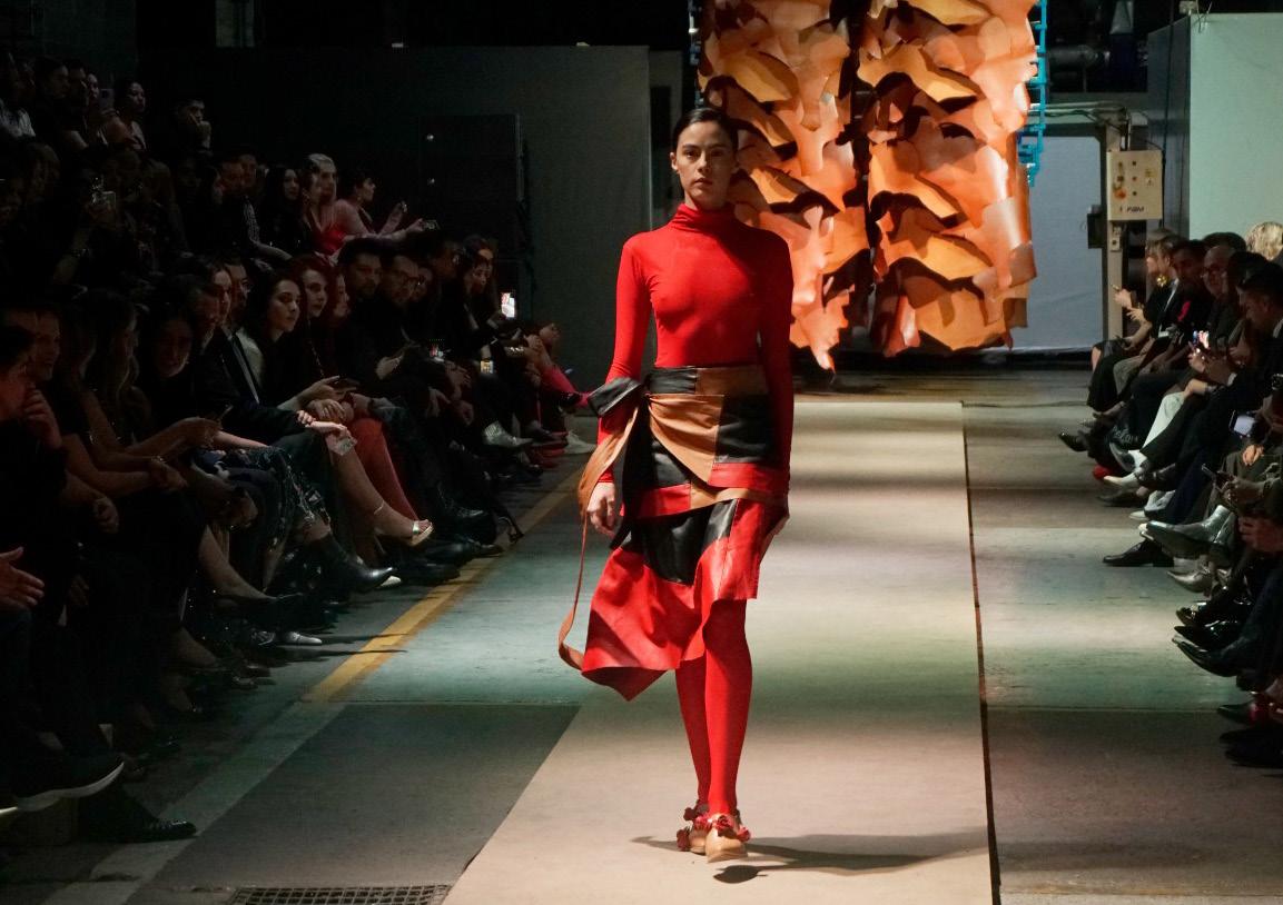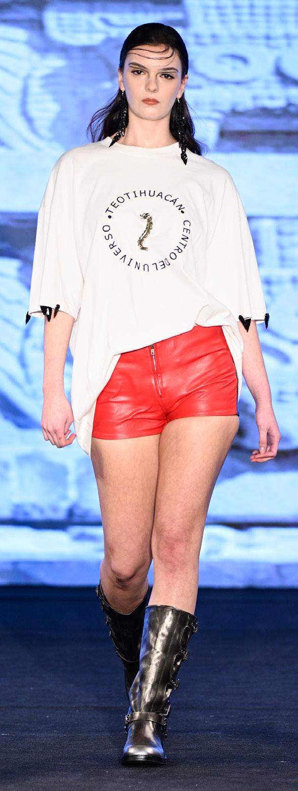 Por su parte Cynthia Buttenklepper quien crea colecciones controladas de piezas limitadas, utilizando remanentes textiles (dead stock fabrics) de alrededor del mundo, implementando métodos tradicionales, que rinden homenaje a la preservación de siluetas clásicas. Cynthia presentó su colección llamada “Nací como una mujer humano-animal” inspirada en la vida de Leonora Carrington, en la que experimenta, con la esencia de materiales y el imaginario, encontrando así un sitio en el que las siluetas dialogan con la figura humana. Construida en movimiento, las prendas envuelven al cuerpo con texturas y colores, encontrando belleza en lo poco común evocando una femineidad ambigua.