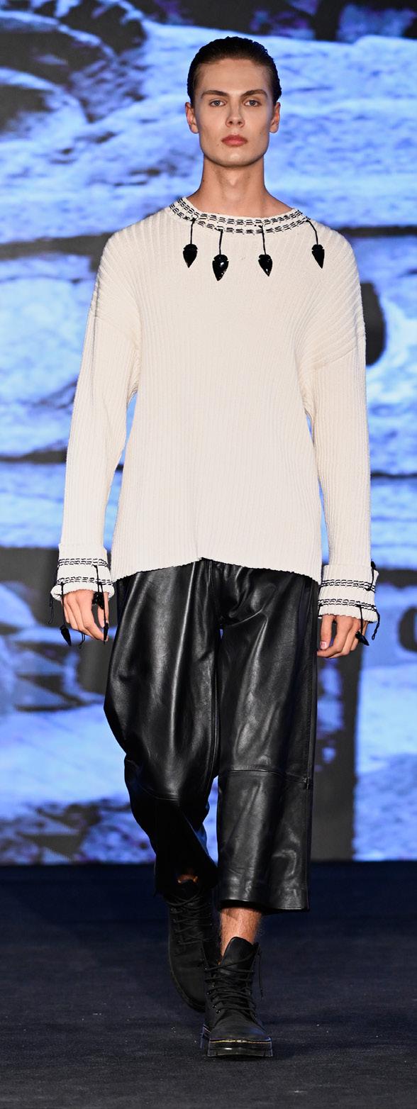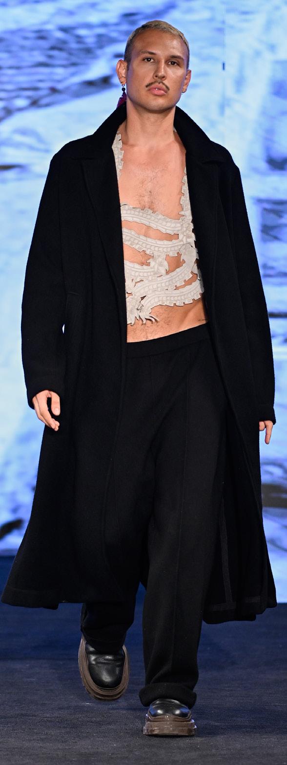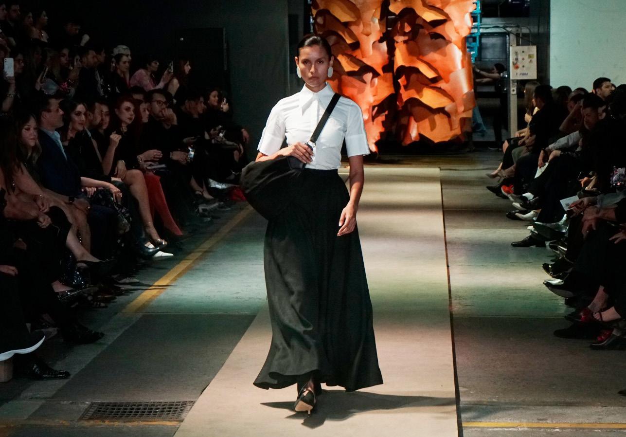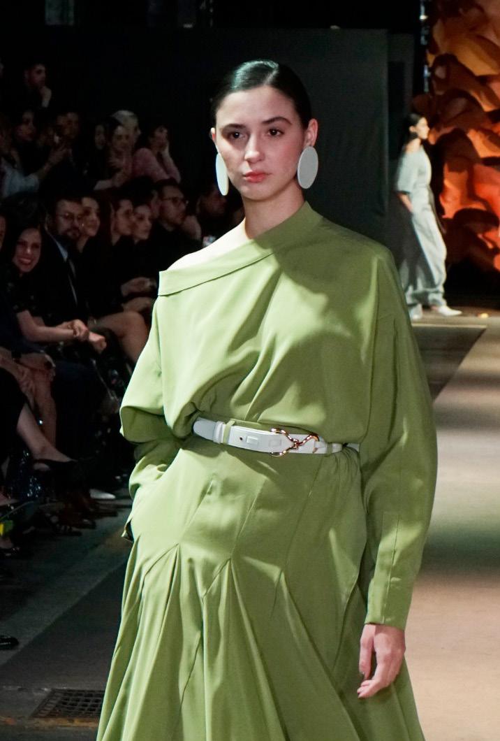 Por su parte Cynthia Buttenklepper quien crea colecciones controladas de piezas limitadas, utilizando remanentes textiles (dead stock fabrics) de alrededor del mundo, implementando métodos tradicionales, que rinden homenaje a la preservación de siluetas clásicas. Cynthia presentó su colección llamada “Nací como una mujer humano-animal” inspirada en la vida de Leonora Carrington, en la que experimenta, con la esencia de materiales y el imaginario, encontrando así un sitio en el que las siluetas dialogan con la figura humana. Construida en movimiento, las prendas envuelven al cuerpo con texturas y colores, encontrando belleza en lo poco común evocando una femineidad ambigua.