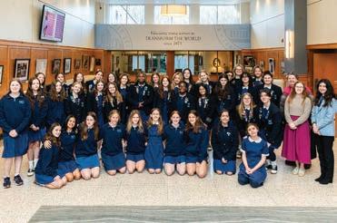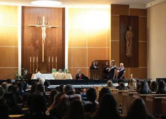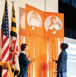 created by the School Sisters of Notre Dame in St. Louis, as well as a handcrafted NDP banner. During a gratitude procession, white roses were presented to recognize the present and past members of the NDP community. The Communion meditation featured the premiere of “Follow the Star,” a choral and string piece based on the writings of Blessed Theresa of Jesus, which NDP alumna Leia Sofia Mendez ’19 composed for the Liturgy. Anniversary pins for all students, faculty, and staff were blessed.
