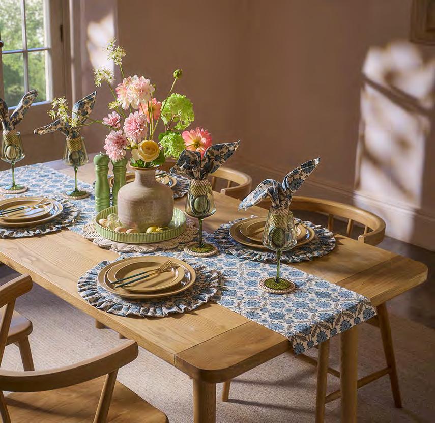 New for spring/summer, the blue block-print table linens - including runners, placemats and napkins - make a fresh backdrop for colourful faux blooms, green wine glasses, classic salt and pepper mills and other accessories.