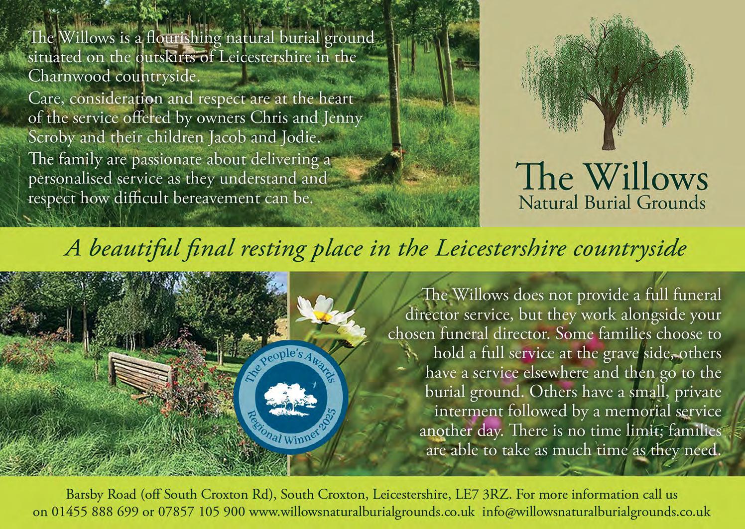 The Willows is a 10-acre family-owned natural burial site near South Croxton, with commanding views of the Charnwood countryside, where people can be buried in hand dug graves in eco-friendly coffins or caskets, made of biodegradable materials such as cardboard, willow, wool or banana leaf to name a few. Conversely, their ashes can be buried or subsurface scattered, either in bio-degradable urns or simply poured into or onto the ground.