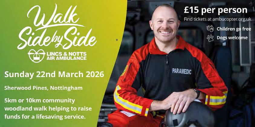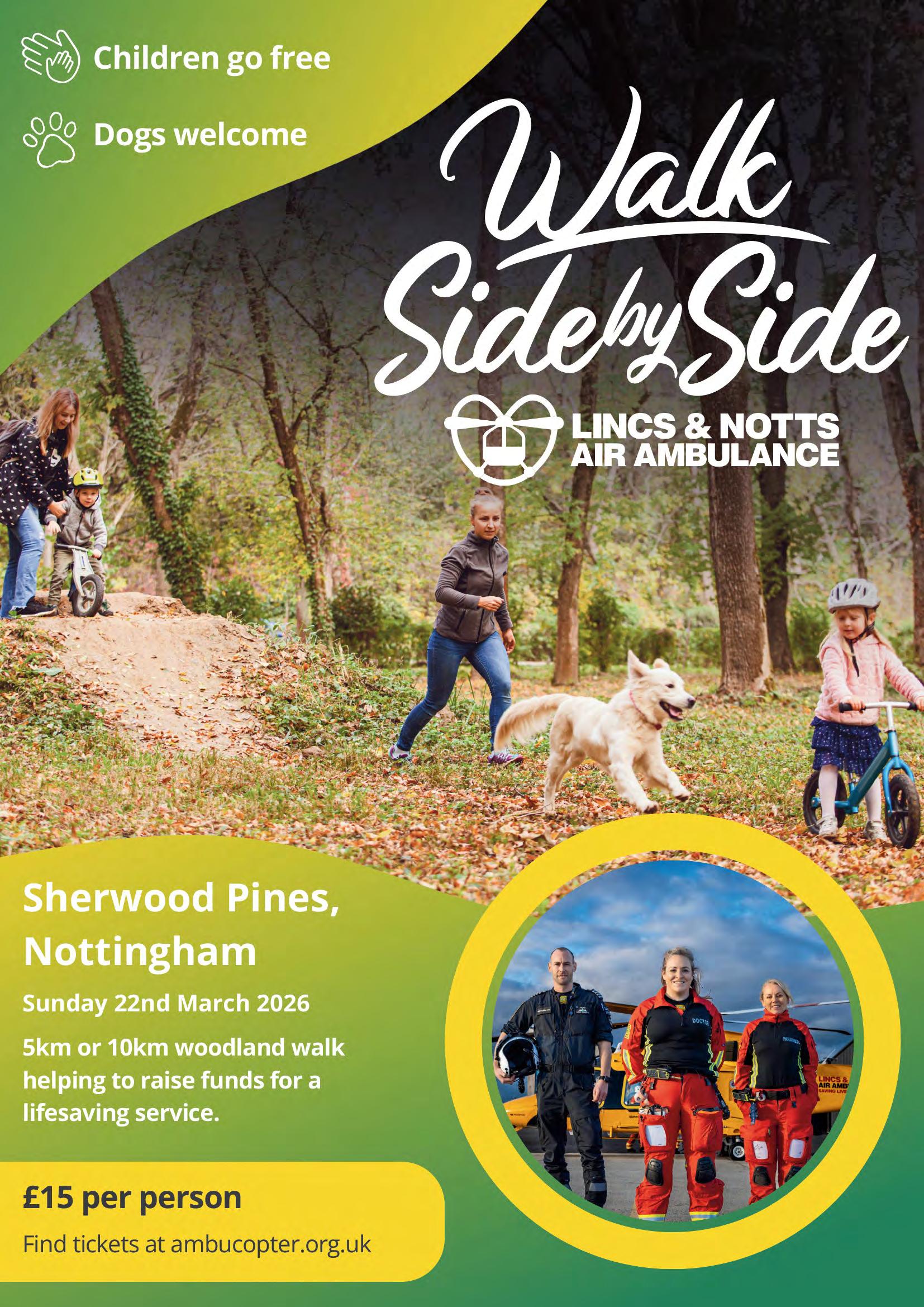 Walk Side by Side with Lincs & Notts Air Ambulance (LNAA) and raise money for this vital, life-saving charity. Join hundreds of walkers to take in the beautiful surroundings of Sherwood Pines on March 22, 2026.