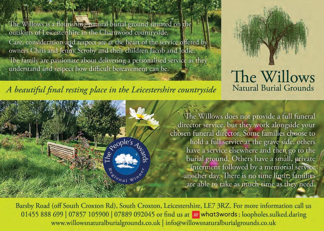 The Willows is a 10-acre family-owned natural burial site near South Croxton, with commanding views of the Charnwood countryside, where people can be buried in hand dug graves in eco-friendly coffins or caskets, made of biodegradable materials such as cardboard, willow, wool or banana leaf to name a few. Conversely, their ashes can be buried or subsurface scattered, either in bio-degradable urns or simply poured into or onto the ground.