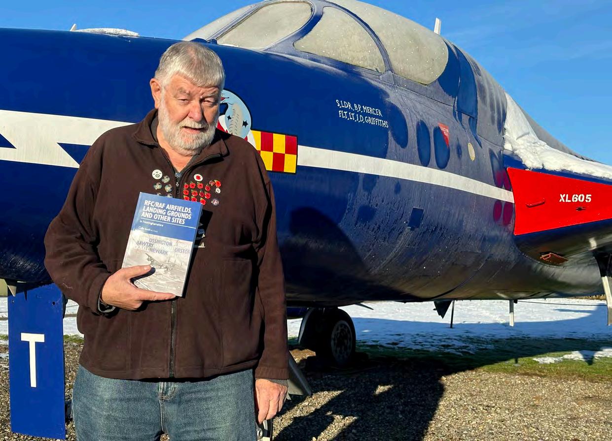 The author, Colin Savill is pictured with his new book in front of his recently repainted Hawke Hunter T7 aircraft at the museum’s site