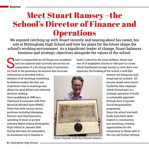 tuart is responsible for all things non-academic build a school for the local children. Stuart was and non-pastoral and currently sits across six one of 15 employees chosen to take part in a team committees of a 20-strong team of governors. which fundraised enough money to cover their own As Clerk to the governors, he ensures that accurate expenses, the building of the school, a well (the information is provided well in nearest one being one mile advance of all meetings, something away) and an orchard. All he believes makes the best use monies raised were matchof governor time in meetings and funded by their employer allows for good debate and informed which formed part of a decision-making. strategic operation to build Since qualifying in 1989 as a a sustainable approach Chartered Accountant with Peat through their Corporate Marwick Mitchell (now KPMG) Social Responsibility Stuart has held various senior programme. positions including Managing Since the school was built, Director and Chief Executive, locals have been skills spending 21 years in private trained in construction industry before joining Nottingham and surveying, creating High School in January 2016. opportunities for the During that time, he remembers community to obtain jobs in an emotional trip to Zambia to the city and further develop Stuart Ramsey with the School’s Charter 8 | Nottingham High School