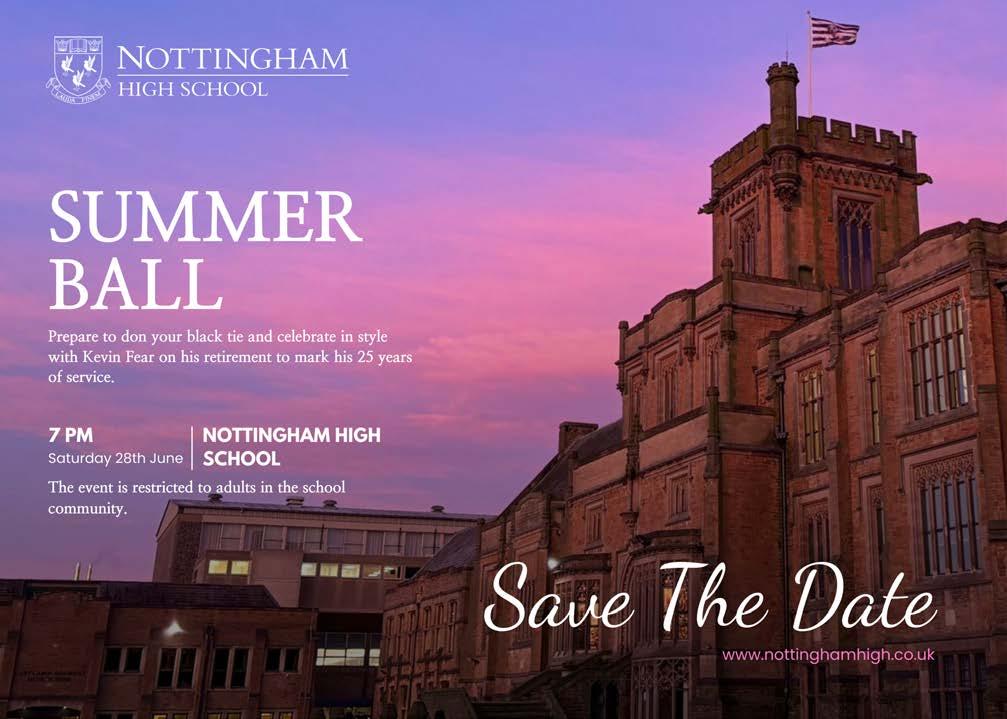Nottingham High School invites you to ‘Save the Date’ for its summer Ball to celebrate in style with Kevin Fear on his retirement, to mark his 25 years of service to the School. Further information and tickets sales will be sent out in January 2025 when we expect the event to sell out quickly. We look forward to seeing you all there!