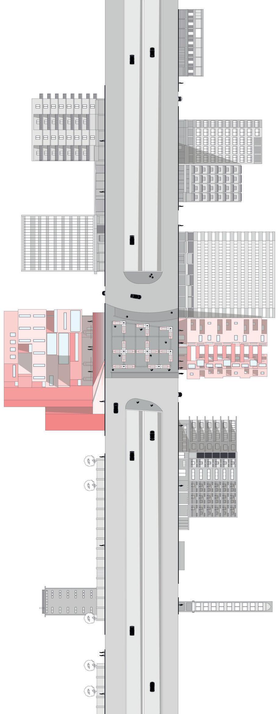 The combina�on of a monumental base and industrial first floor facade, represent the extremes of both the surroundings of past and present.