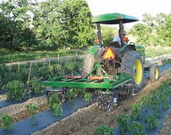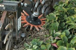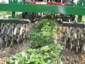 front position which are used to narrow the row and cut through the straw. A coil tine follows and fractures the soil which has been packed by foot traffic during harvest. The rolling cultivator in the rear rolls soil back toward the strawberry plants. Cultivating speed is 3-4 mph with two passes normal for each row. This machine is more economical and less disruptive of soil structure than a rototiller.
