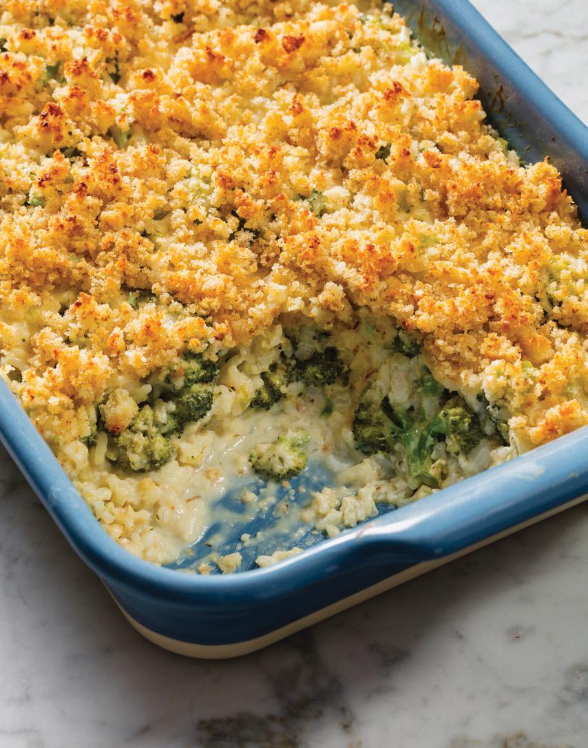 By America’s Test KitchenWith tender rice, bites of fresh broccoli, and bold sharp cheddar flavor, this casserole is irresistible— nothing like the typical back-of-the-soup-can recipe. Instead of canned soup, use a mixture of half-and-half and chicken broth as the rich base, and then add plenty of extra-sharp cheddar and nutty Parmesan cheese. Using the sweet broccoli stalks as well as the florets really maximizes the broccoli flavor. Since the stalks take a bit longer to cook, sauté the chopped stalks in butter with onion before adding the rice, liquids, and broccoli florets (parcooked in the microwave for a jump start). For a substantial crowning touch, sprinkle on some garlicky fresh bread crumbs enriched with more Parmesan. This textural topping bakes up brown and crispy while the casserole bubbles enticingly at the edges.
