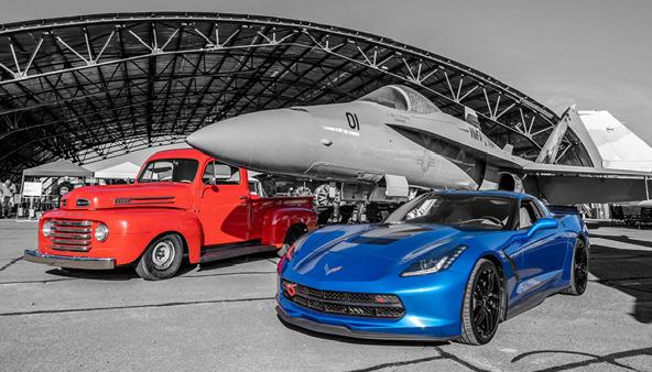 A unique gathering of meticulously restored classic and muscle cars from every era and description. The cars are parked right next to some of the museum’s high performance historic aircraft
