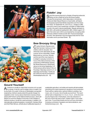 pend the evening dancing in a theater of towering redwoods jutting out into a starlit sky at the Old Grove Festival. This year the annual event, which takes place in Armstrong Redwoods State Natural Reserve in Guerneville, will feature the bluegrass bands Dead Winter Carpenters and One Grass Two Grass. On September 16, 4:30–10 p.m., indulge in a little brew and a meal or just a sweet treat, and listen to fiddle-fueled sounds in the park’s natural amphitheater. Regular admission is $28–$35, with preferred seating $44–$80; children ages 0–12 get in free when each child is accompanied by one paying adult, otherwise children’s tickets are $8–$10. Food and beverages are extra. See stewardscr.org/cms/pages/index.html for more information and to purchase tickets. ¶