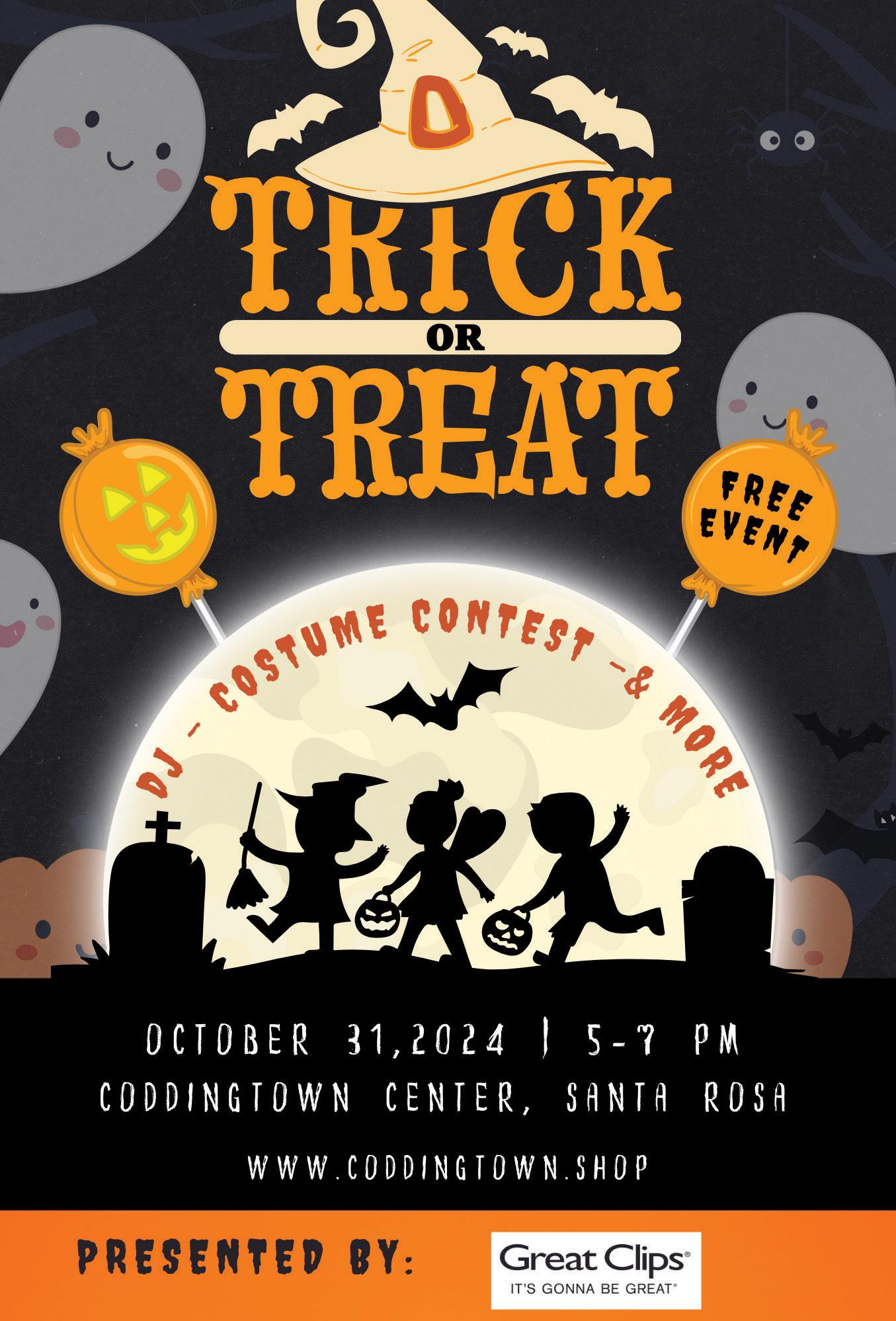 Trick-or-Treating at Coddingtown Mall. Costume contest, free candy throughout the center, DJ, haunted house, arts & crafts, face painting, & more. 5–7 p.m. Coddingtown Mall. 1300 Coddingtown Center, Santa Rosa. coddingtown.shop/events.