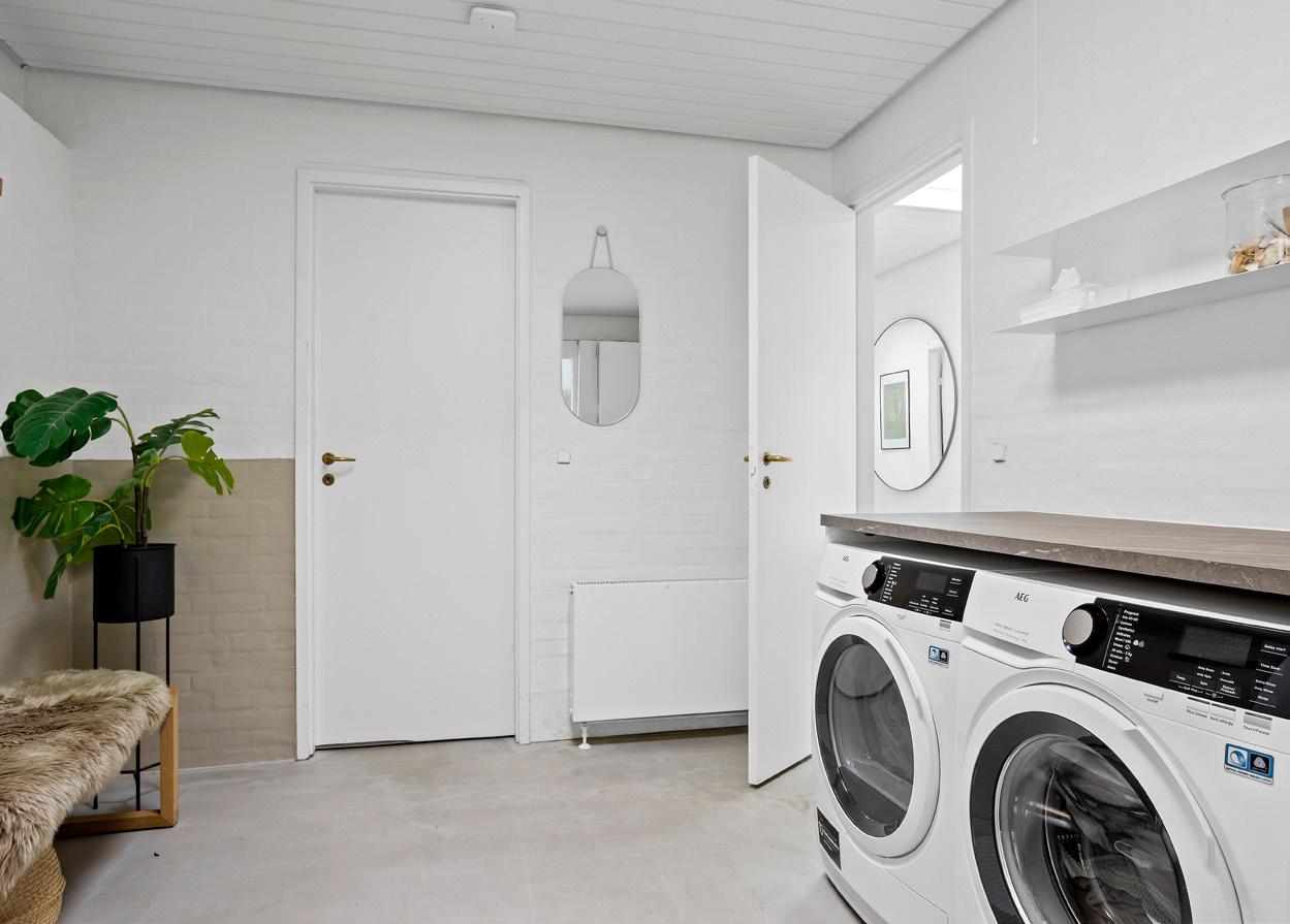 Velkommen indenfor i denne villas store bryggers med adgang fra garage og den overdækkede entre. Rummeligheden og det nyrenoverede rum, giver et imponerende indtryk af boligens minimalistiske stil kombineret med funktion.