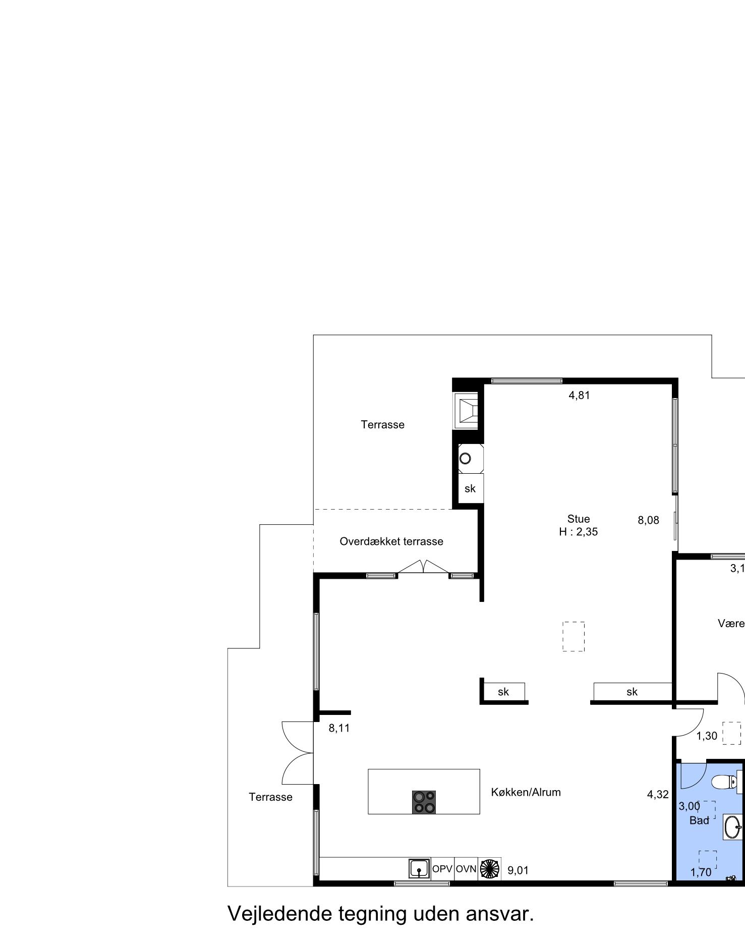 Boligen byder på et stort køkkenalrum, som har åben forbindelse til en stor stue med hyggelig brændeovn, og her sørger de store vinduespartier og indbygget bogreol for en skøn stemning. Særligt kan man bemærke det fantastiske lysindfald og fra både spisestue og køkken kan man nyde udsigten over vandet samtidig med at mærke brændeovnens varme brede sig i huset, fra stuen. Alle de flotte epoxy gulve er med gulvvarme, undtagen værelserne der gerne må være lidt køligere. Fra alrummet har man via en fordelingsgang med ovenlysvinduer, adgang til husets værelser. Hele tre store værelser, hvoraf to har adgang til terrassen. Denne villa byder derforuden på hele tre store badeværelser. Det ene badeværelse er perfekt til dem i huset der nyder at ligge i badekarret og nyde roen, de to andre har store brusenicher og alle badeværelser er udstyret med inventar fra Svane. Til boligen hører også et stort bryggers med teknikrum med plads til opbevaring.