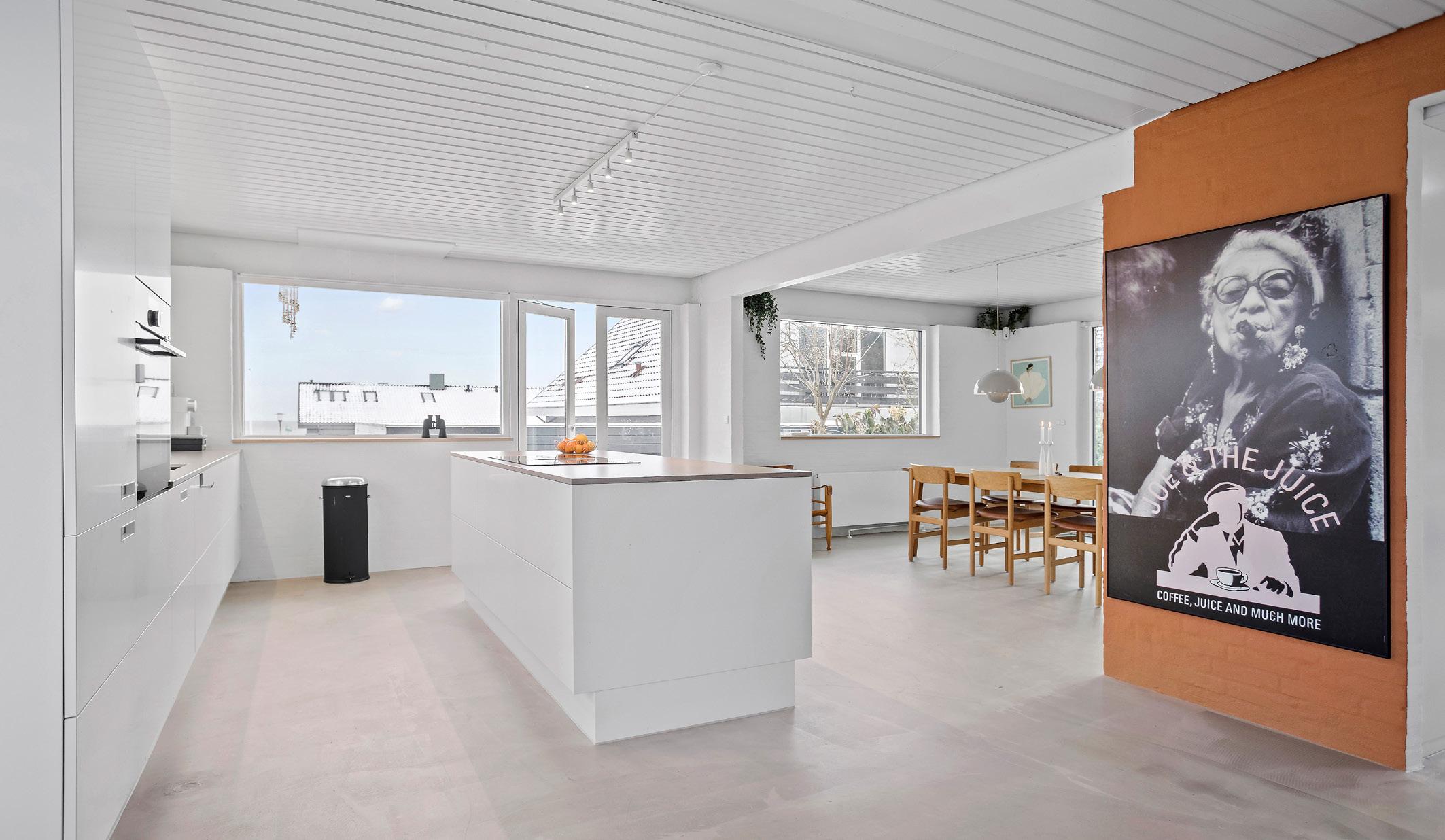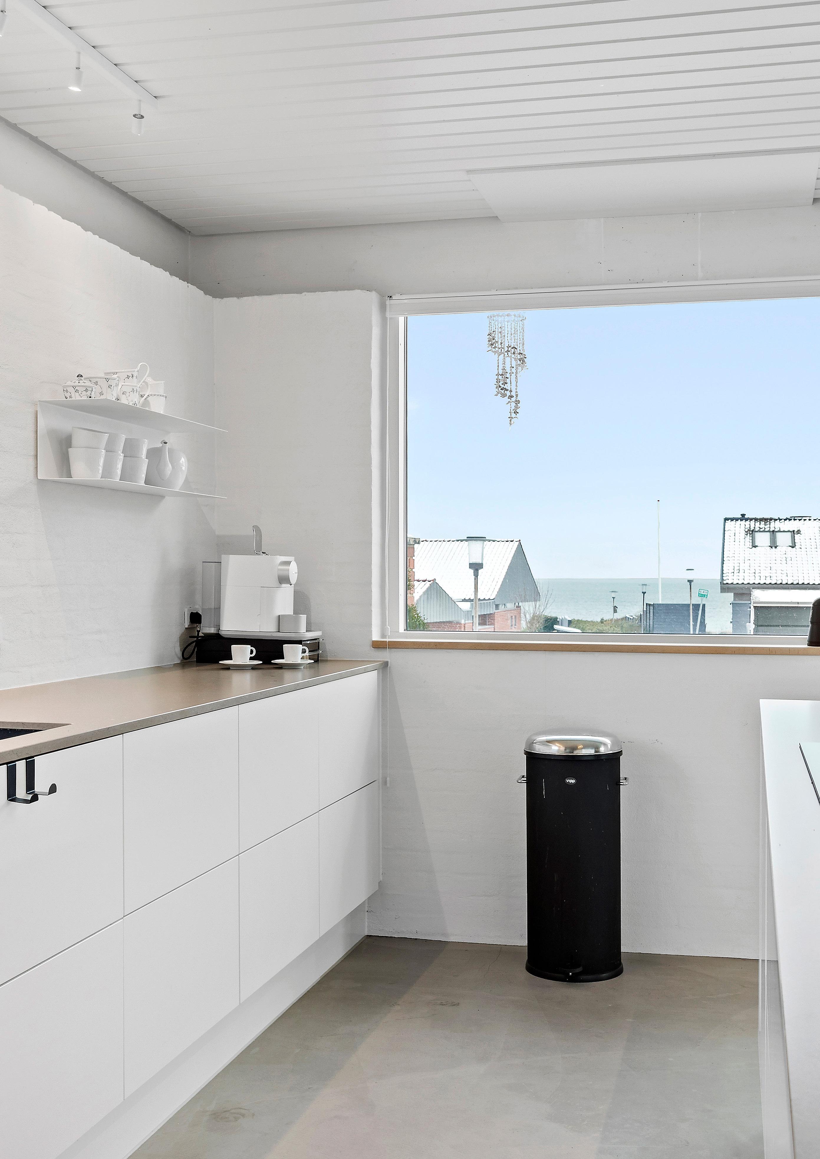 Det smukke hvide køkken fra Svane med en flot Dekton bordplade, er praktisk indrettet med rigelig opbevaringsplads og lækre hvidevarer fra AEG. Fra køkkenalrummet er der direkte adgang til en stor terrasse, hvor maden kan tilberedes og indtages i eftermiddags- og aftensolens stråler. Den flotte naturfarvede bordplade og det hvide køkken giver et behageligt og naturligt look, der komplimenterer havet og strandens farver. Her kan man stå og lave mad med kig ned til sin båd eller se børnene være på vej hjem efter en hurtig tur i vandet. Forestil dig du kan se din familie der sejler ind efter at hyggelig sejl tur mens du gør maden klar.