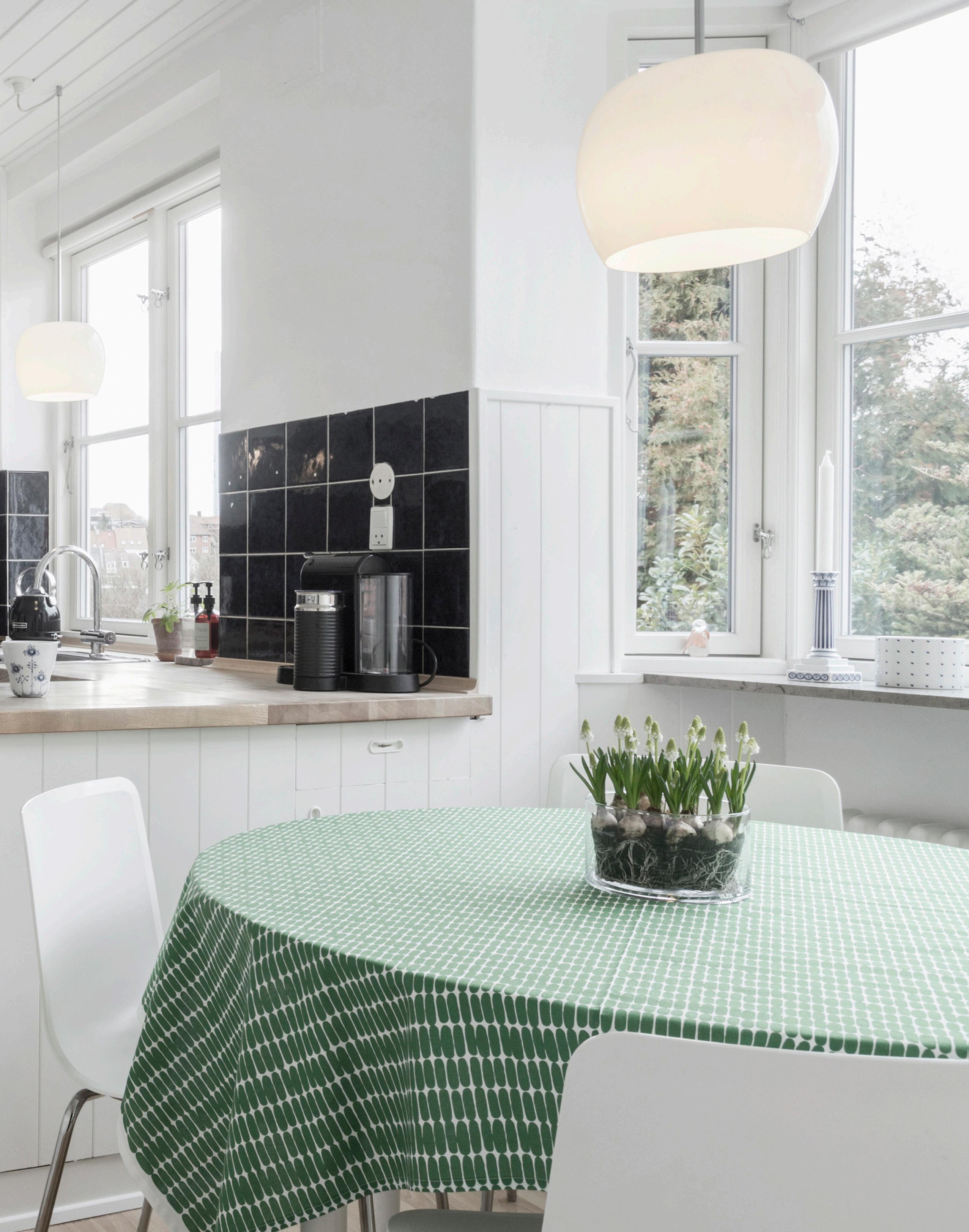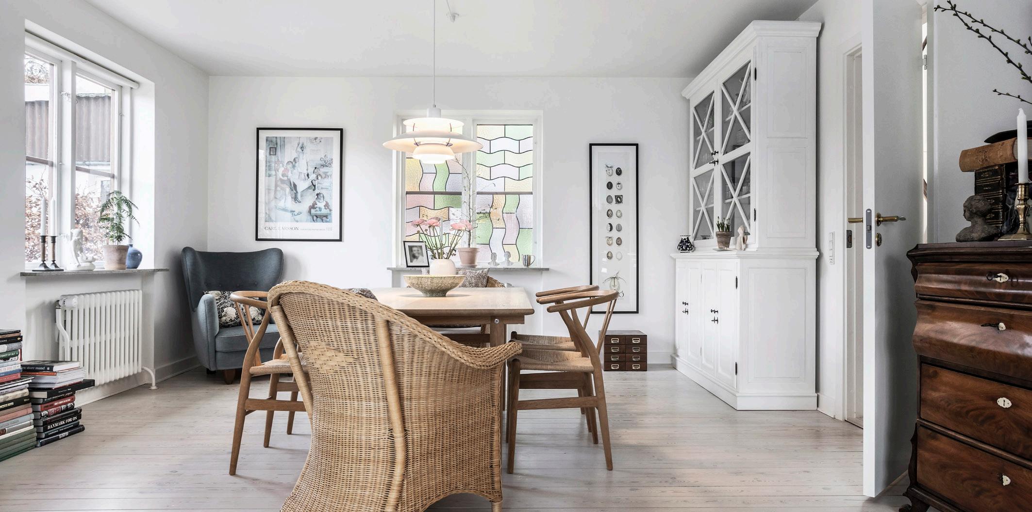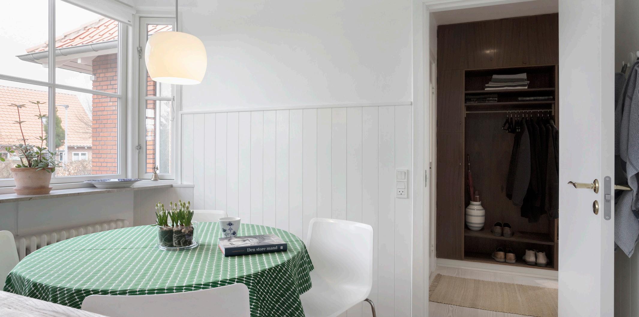 Det hyggelige køkken med spisepladsen i den charmerende karnap danner rammen om hverdagens måltider. Naturligt samles man om det store bord i stuen til alle familiens større måltider og højtider, hvis man da ikke indtager dem på terrassen.