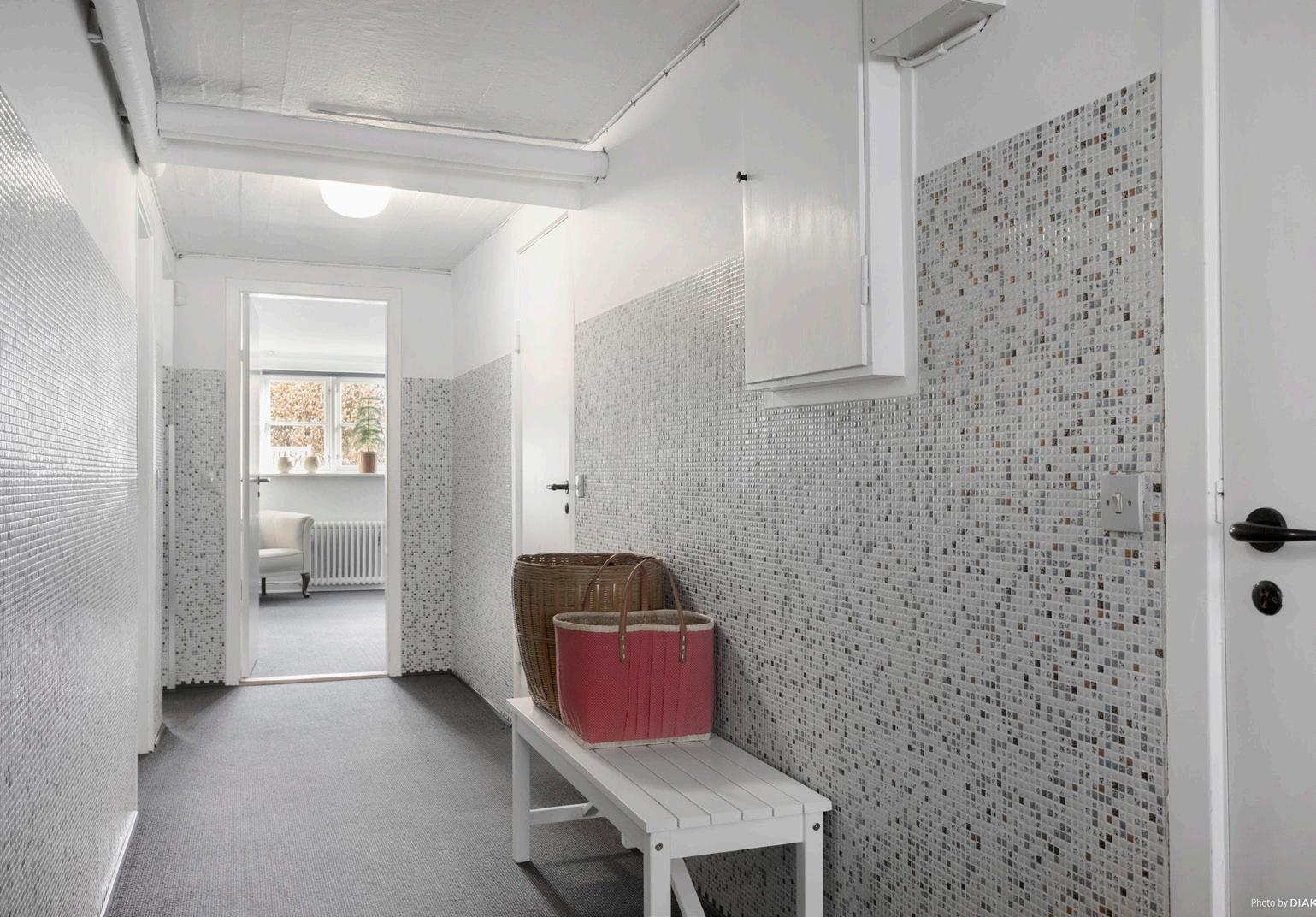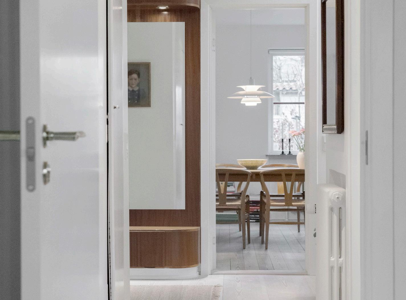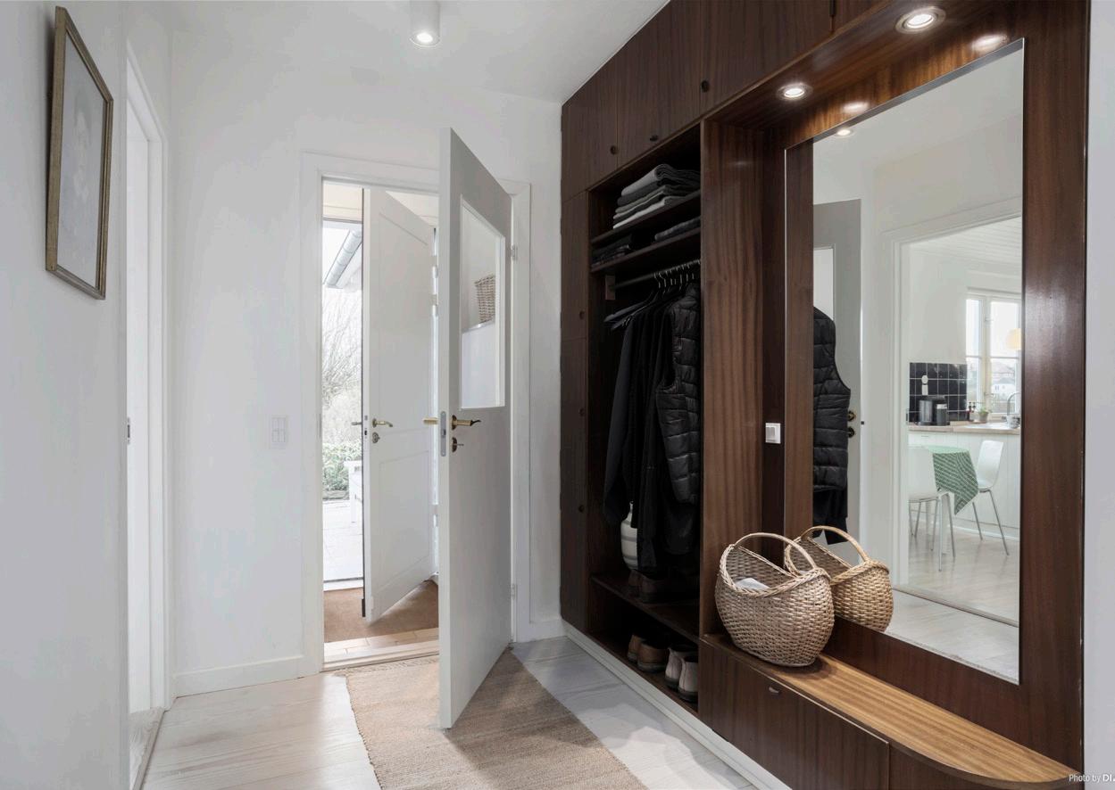 Velkommen indenfor i denne villas store hall, der giver et imponerende indtryk af boligens minimalistiske stil kombineret med de charmerende detaljer. I hall´en er der specialfremstillet sidde og opbevarings element fra 1954 i perfekt stand.