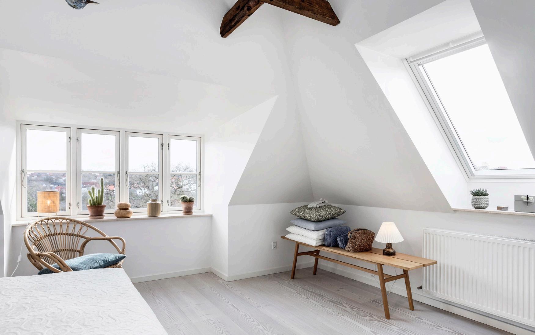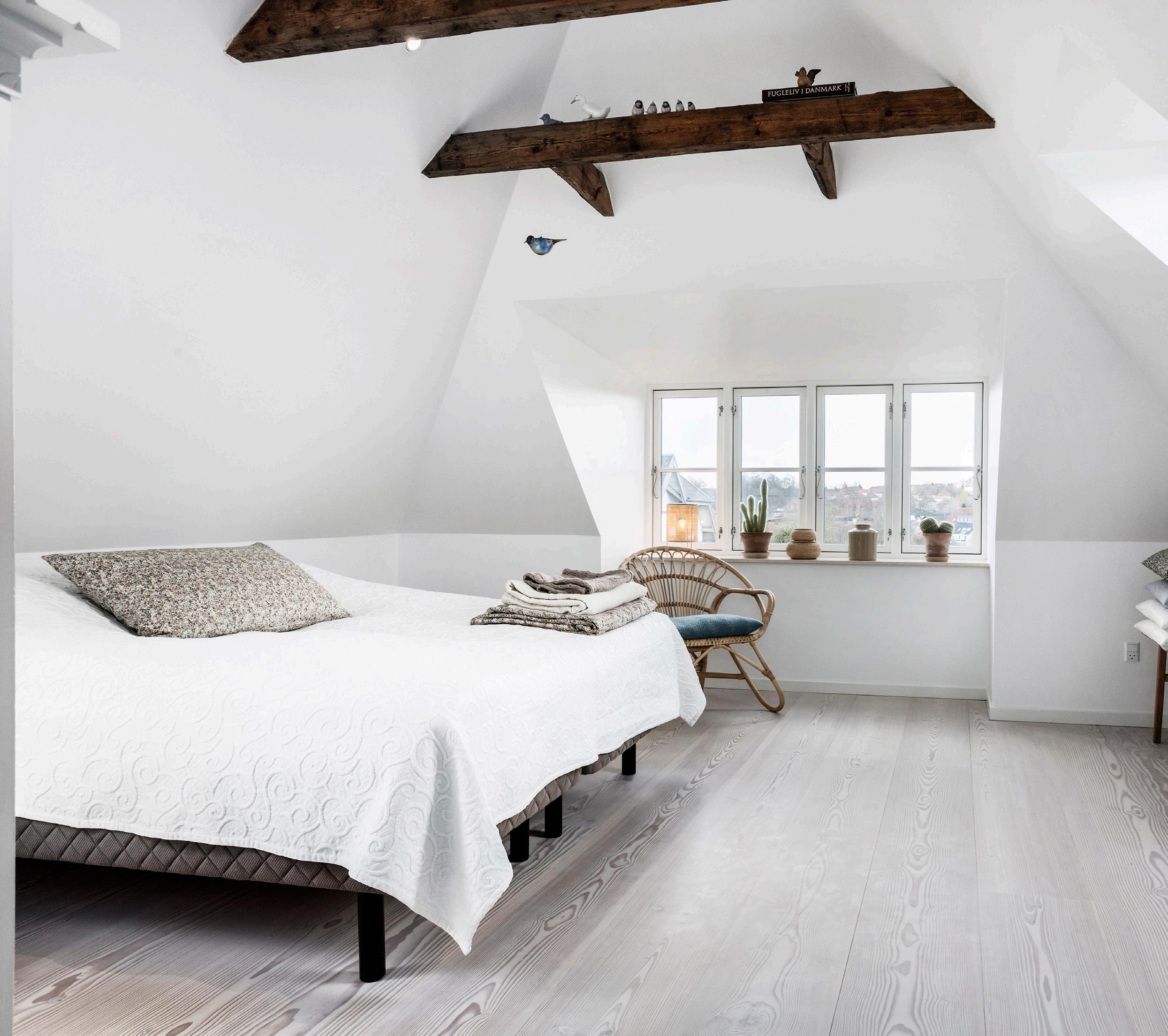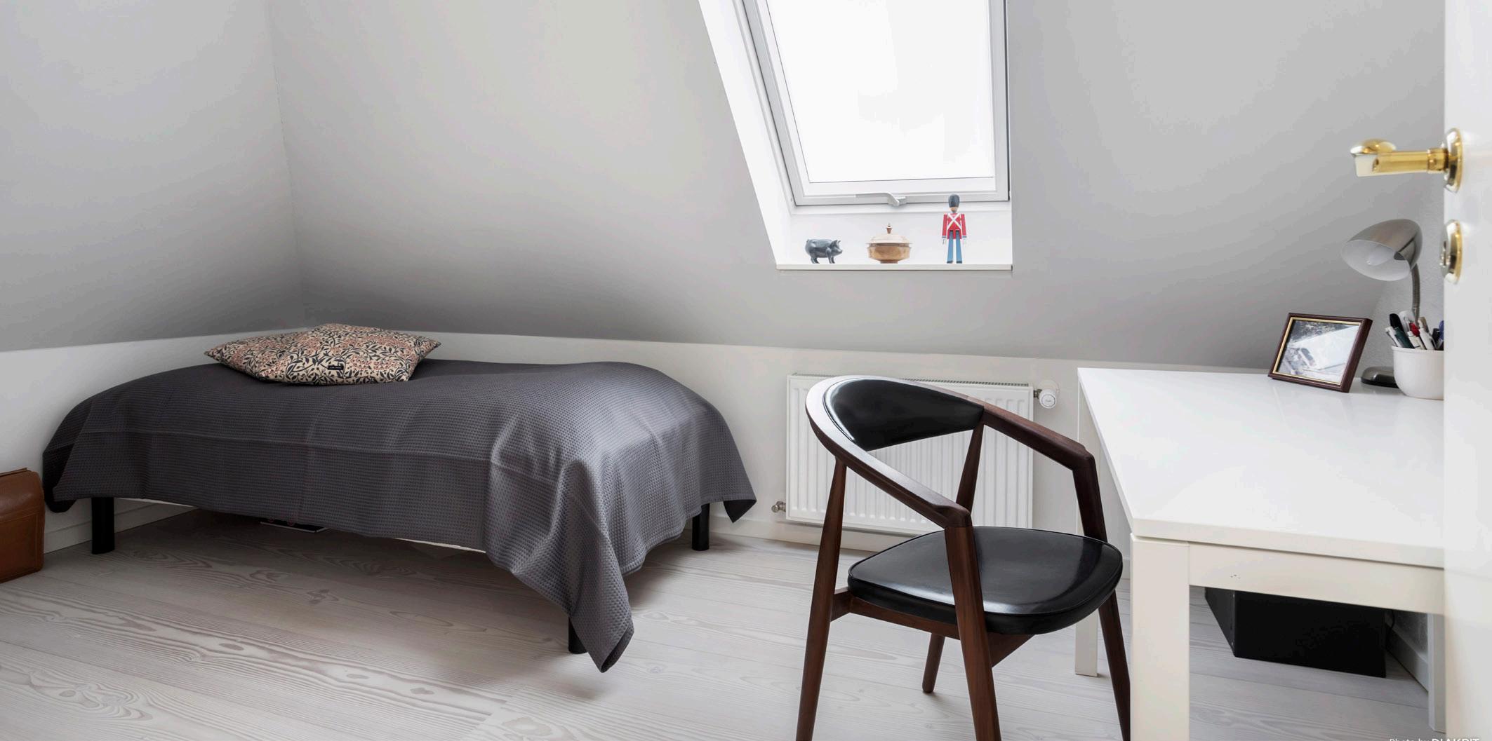 Forældresoveværelset ligger på førstesalen, med loft til kip og den smukkeste udsigt. Lige ved siden af findes førstesalens badeværelse - et stort og rummeligt badeværelse med brus.