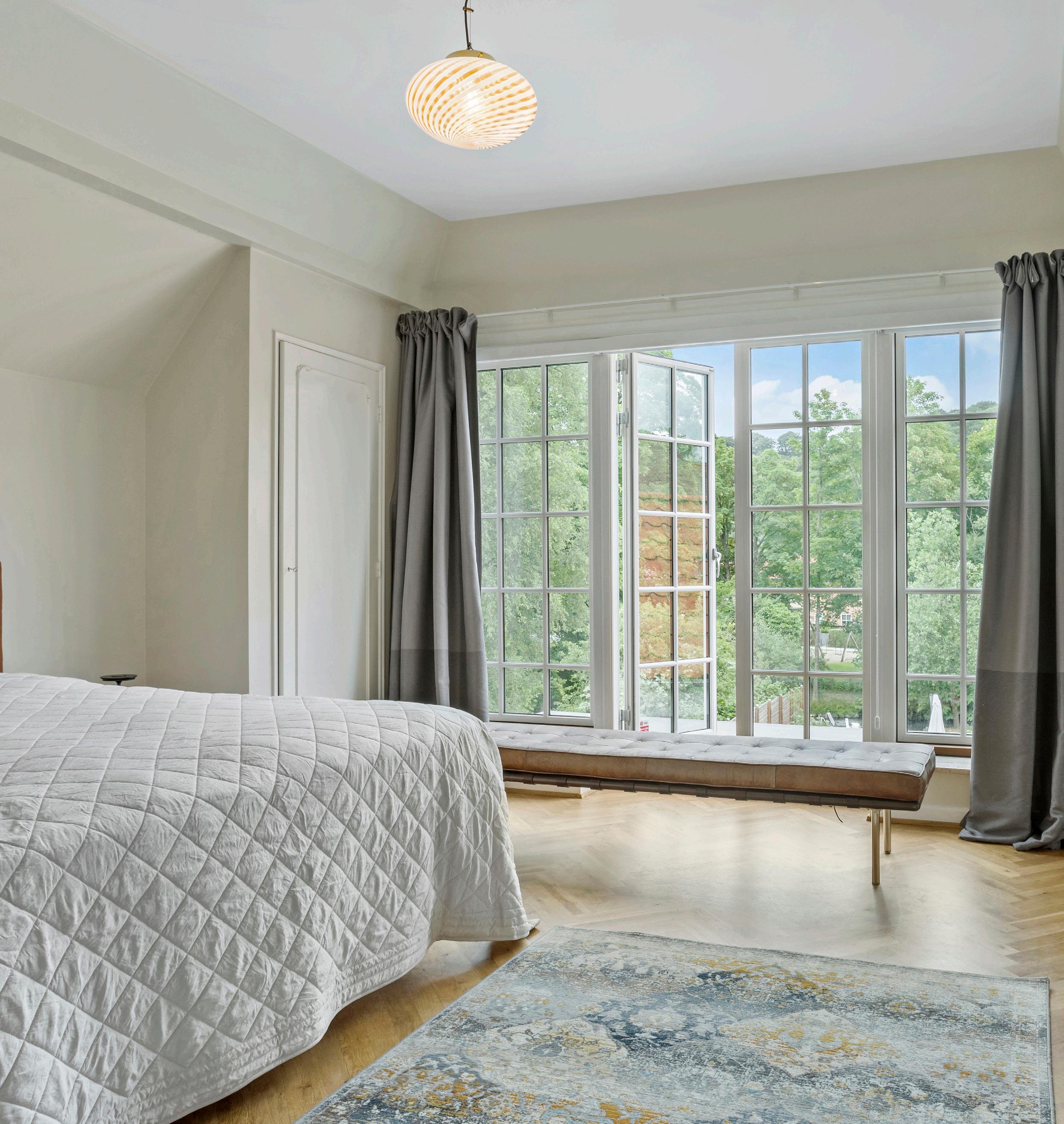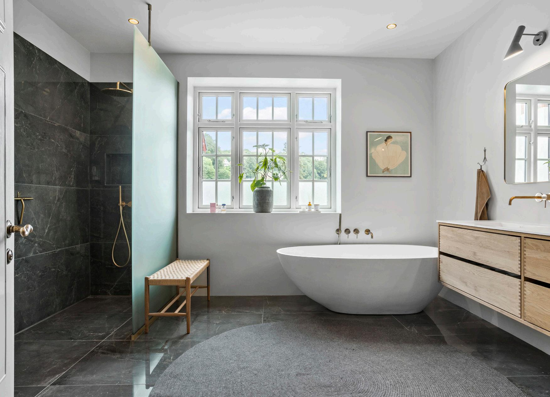 Lige ved siden af soveværelset er der et stort nyt badeværelse med keramiske klinker, samt både stor bruseniche og et fritstående æggeformet badekar af model Rimini fra Spakompagniet, hvor du kan sænke dig ned i det varme vand, mens du nyder udsigten til himlen udenfor. De smukke messingarmaturer fra Simplice falder godt i tråd med husets stil og det samme gør Woodform-interiøret i eg. Også her er en særlig oprindelig detalje bevaret nemlig de to symmetriske indbyggede snedkerskabe, der er håndlavede tilbage i 1940’erne med det smukkeste interiør.