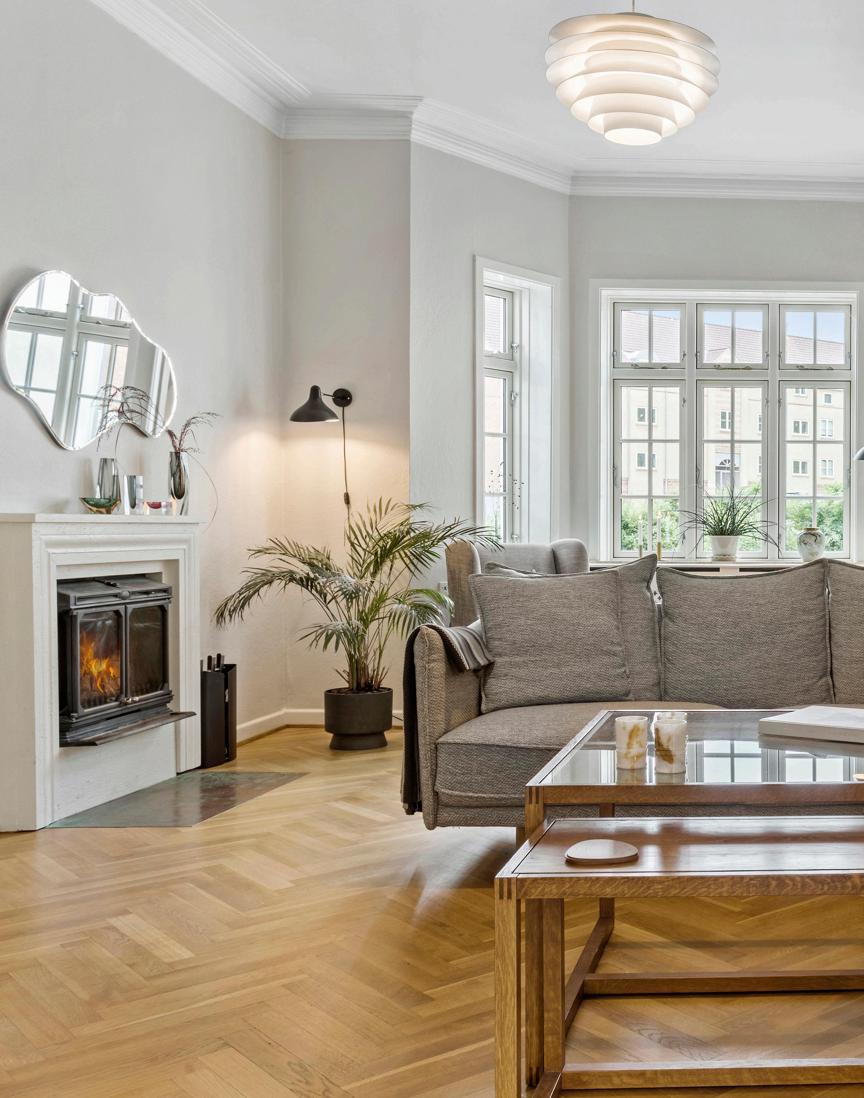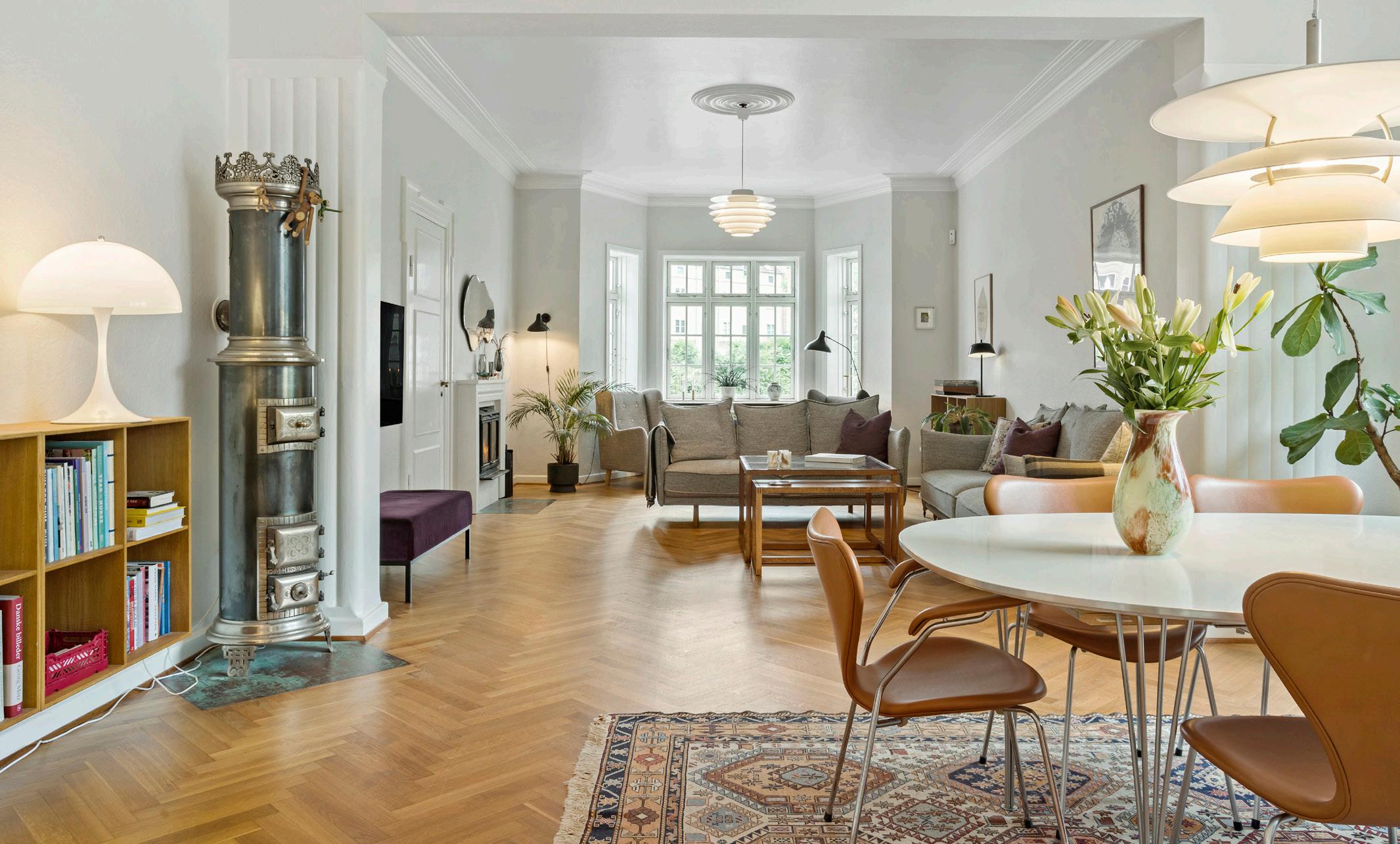 Med store åbne rum, højt til loftet og en charmerende blanding af historiske og moderne elementer er dette hjem perfekt til dem, der sætter pris på elegancen fra en svunden tid kombineret med moderne luksus. De originale, massive sildebensparketgulve, det detaljerede stukarbejde og de omhyggeligt bevarede historiske detaljer står side om side med moderne bekvemmeligheder som nye faciliteter, klimasikring samt opdaterede installationer, hvilket sikrer en både funktionel og stilfuld bolig. Boligen er indrettet i en opdateret Mid Century Modern-stil med smukt originalt træarbejde, indbyggede opbevaringsløsninger og omhyggeligt udformede skabe og en særlig kombination af varme naturmaterialer og lyse konstruerede udsmykninger. Hvert element, fra stuklofterne til den detaljerede ornamentik på låger, karme og gerigter, det komplicerede snedkerarbejde på døre og skabe og de elegante indfatninger omkring vinduerne, vidner om den håndværksmæssige kvalitet, der kendetegner boligen og at den oprindeligt blev bygget til velhavende folk.