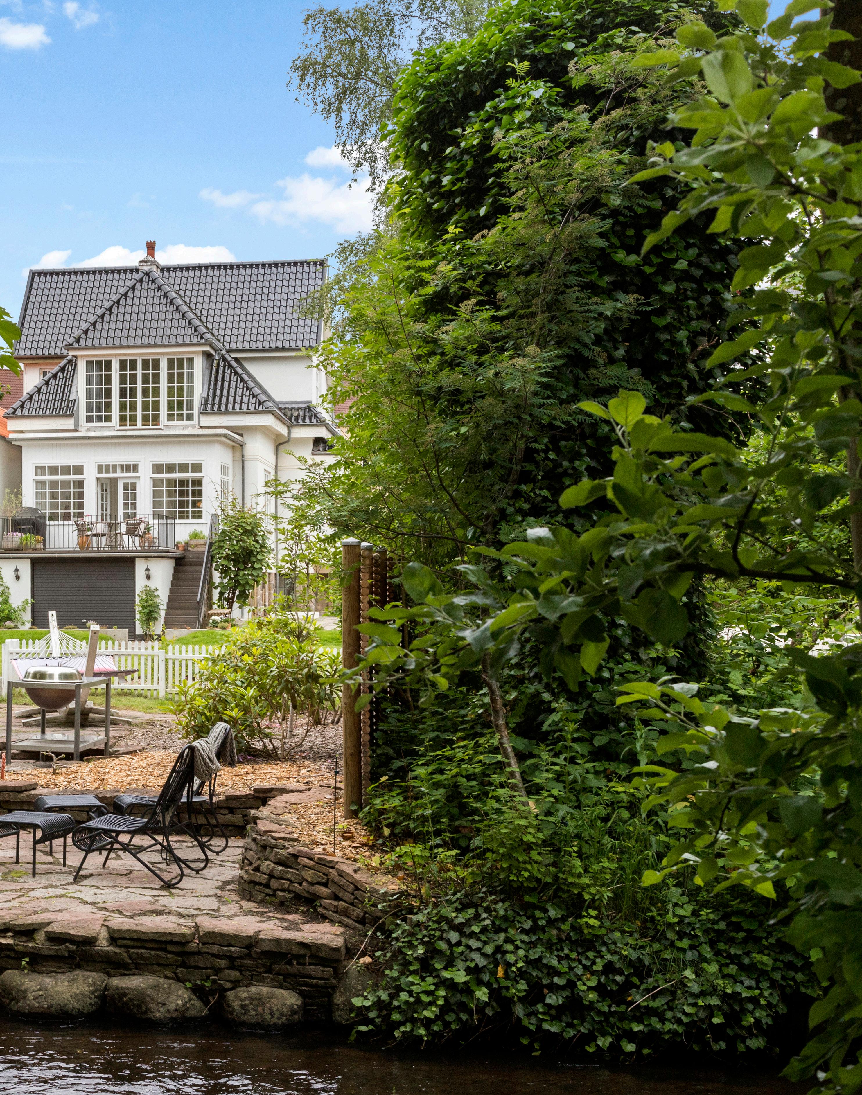 De niveaudelte plateauer er med til at klimasikre grunden og er belagt med originale svenske ølandsbrud ved åen – et oplagt område til hygge på lyse sommeraftener med bål og stearinlys.