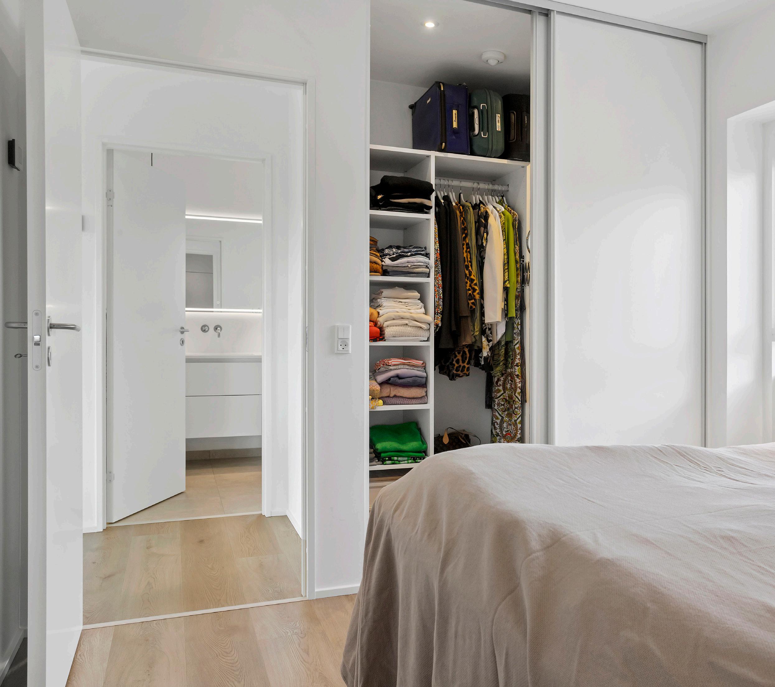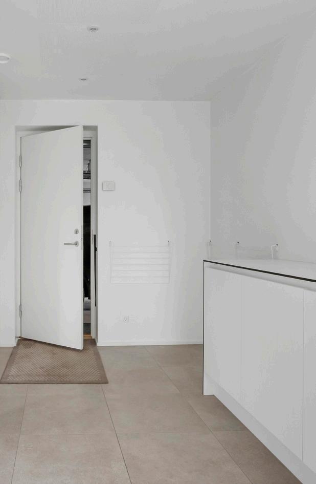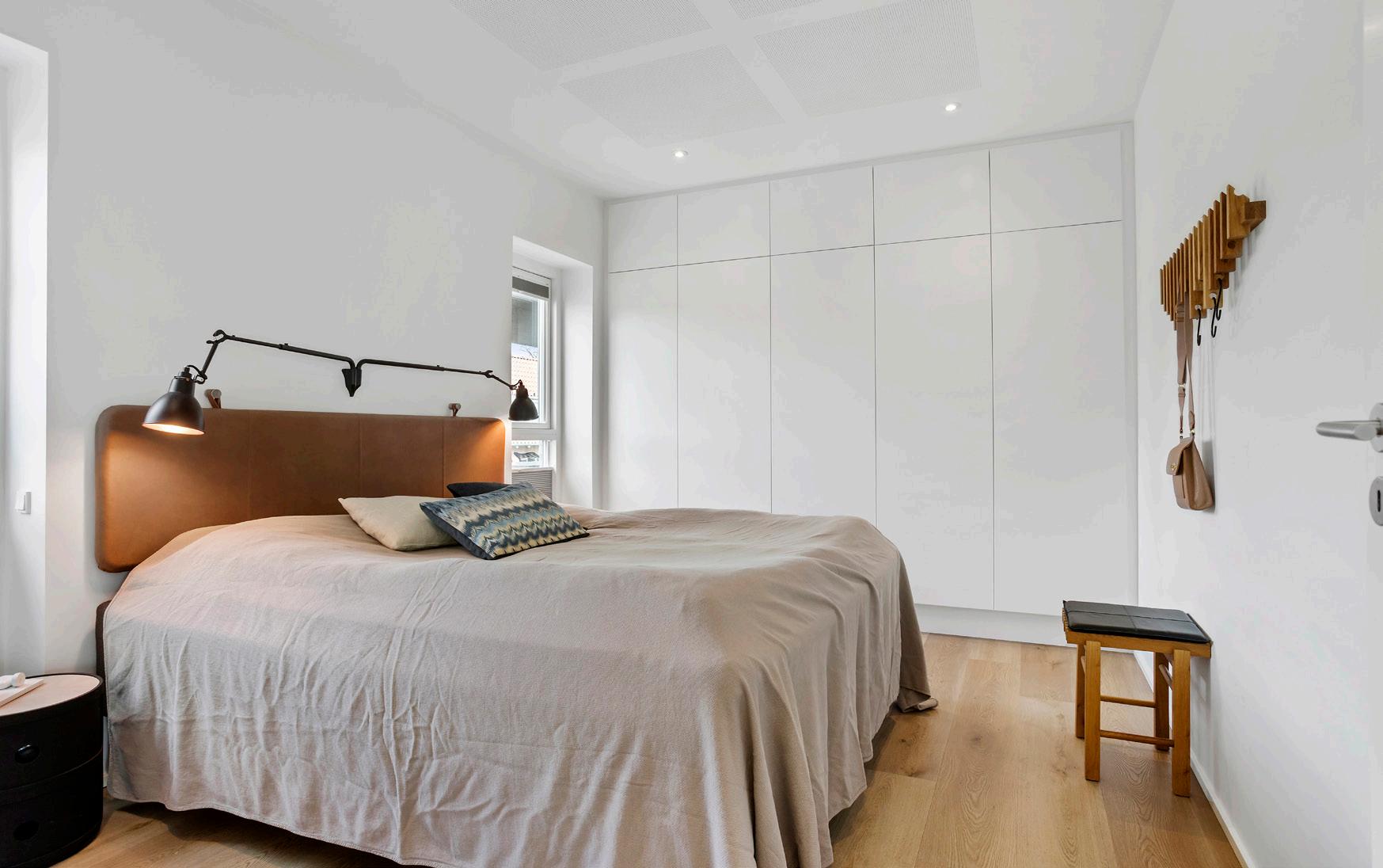 Opbevaringsplads er naturligvis indtænkt i det arkitekttegnede hus og der er masser af skabsvægge i begge værelser. Alt er holdt i indbydende lyse farver og med godt lysindfald.