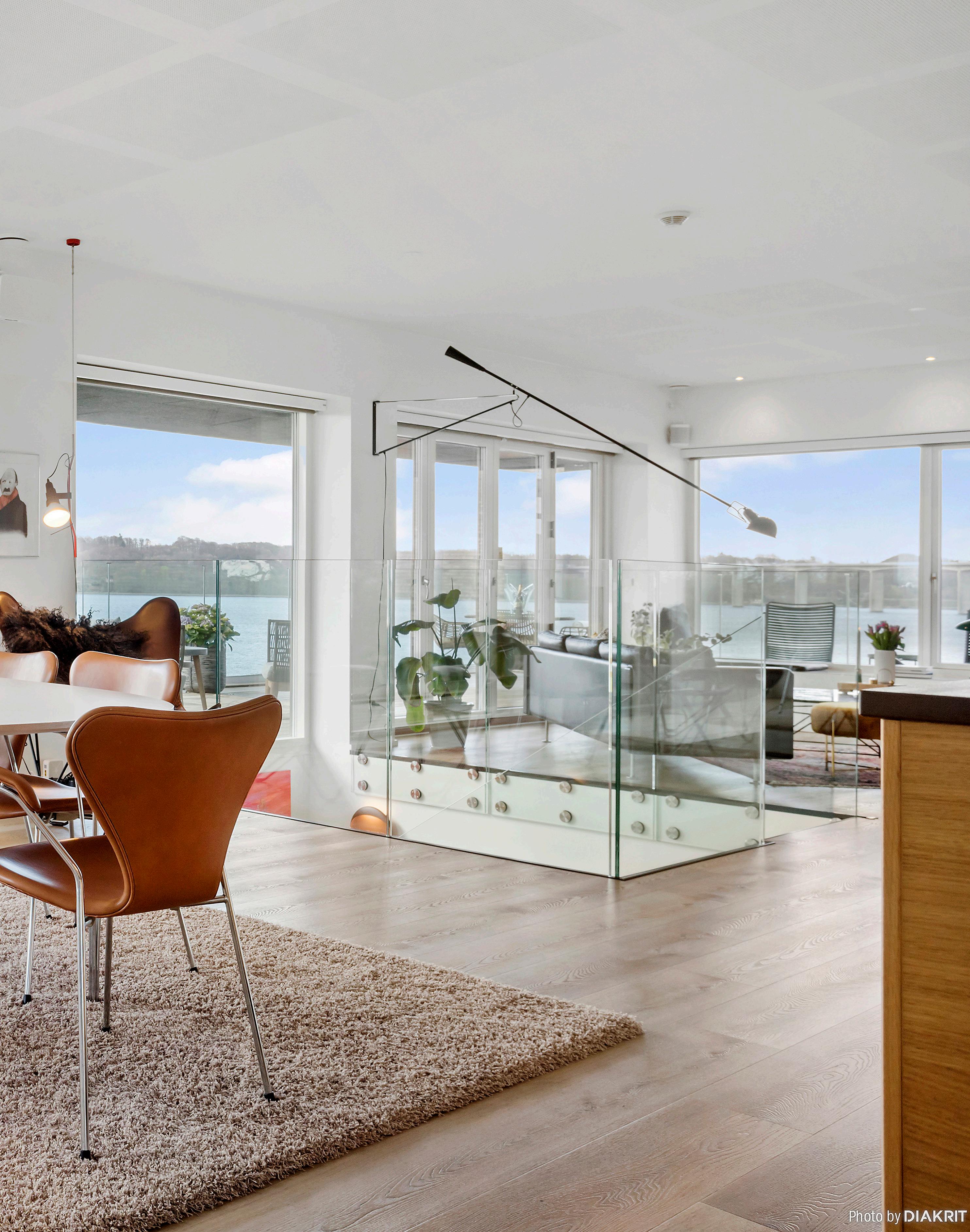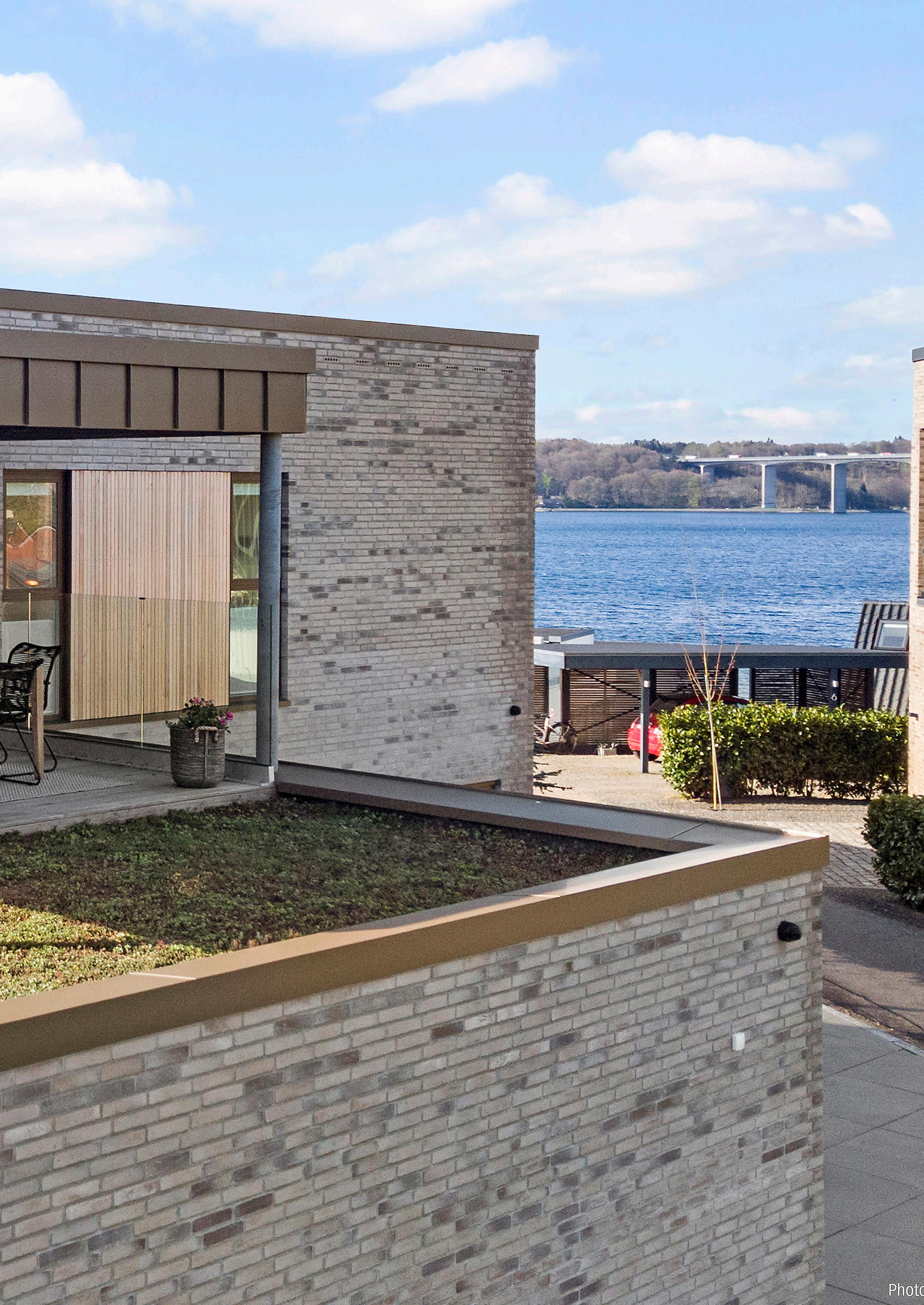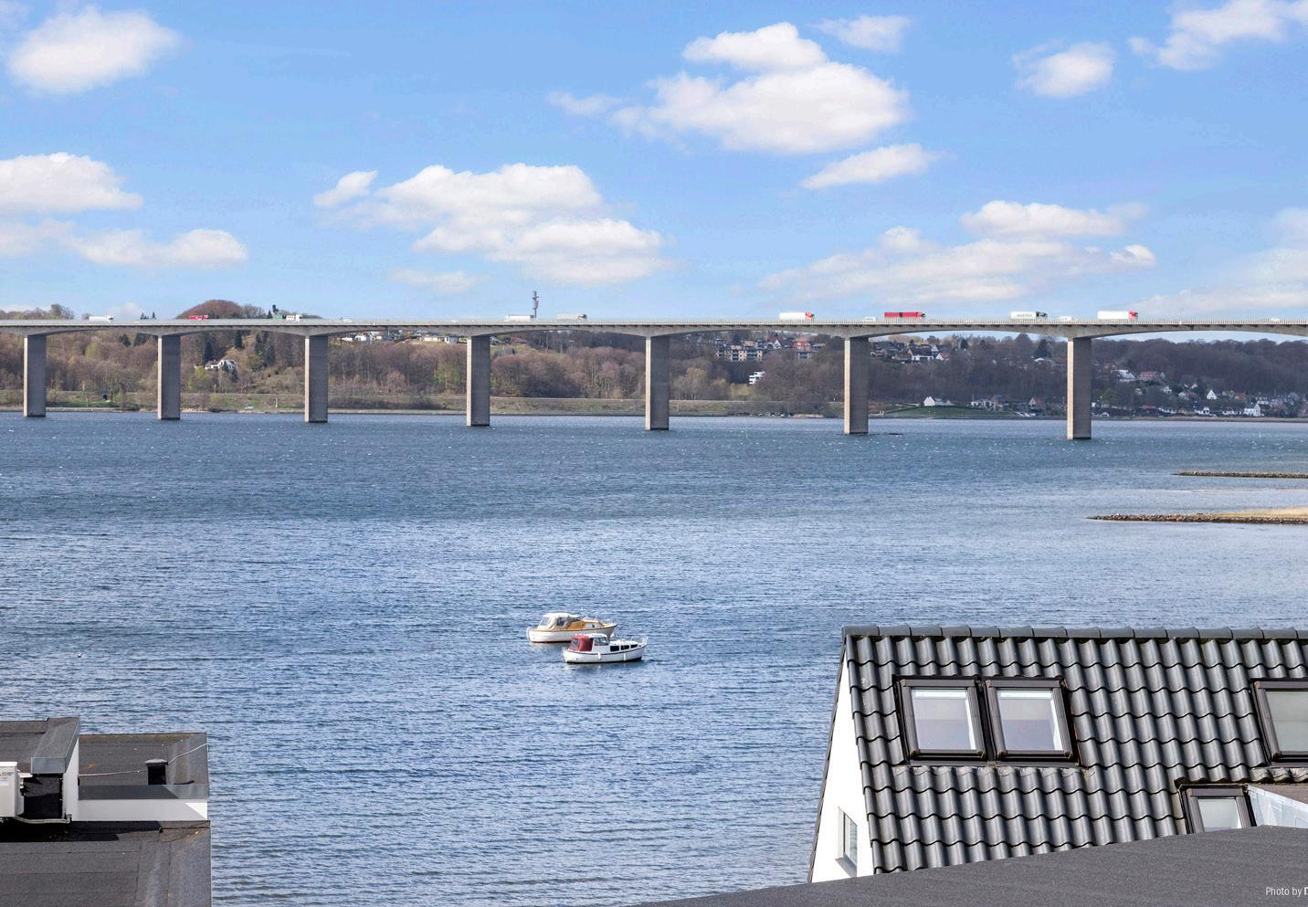 For at udnytte den formidable udsigt optimalt, er etagerne vendt i forhold til dansk standardbyggeri. Stue, køkken samt master bedroom og badeværelse er placeret på øverste etage, hvilket giver den absolut bedste udsigt fra alle rum. Den store stue, der er kombineret med køkkenet, er ubetinget husets hjerte og samlingssted. Her kan du følge årstidernes skiften og den smukke silhuet af Vejlebroen gennem de velisolerede 3-lags gulv-til-loft vinduer med lydglas. De indbydende varme Nordic Roots Boston Oak akustik designgulve komplimenterer på smukkeste vis den skandinaviske designstil.