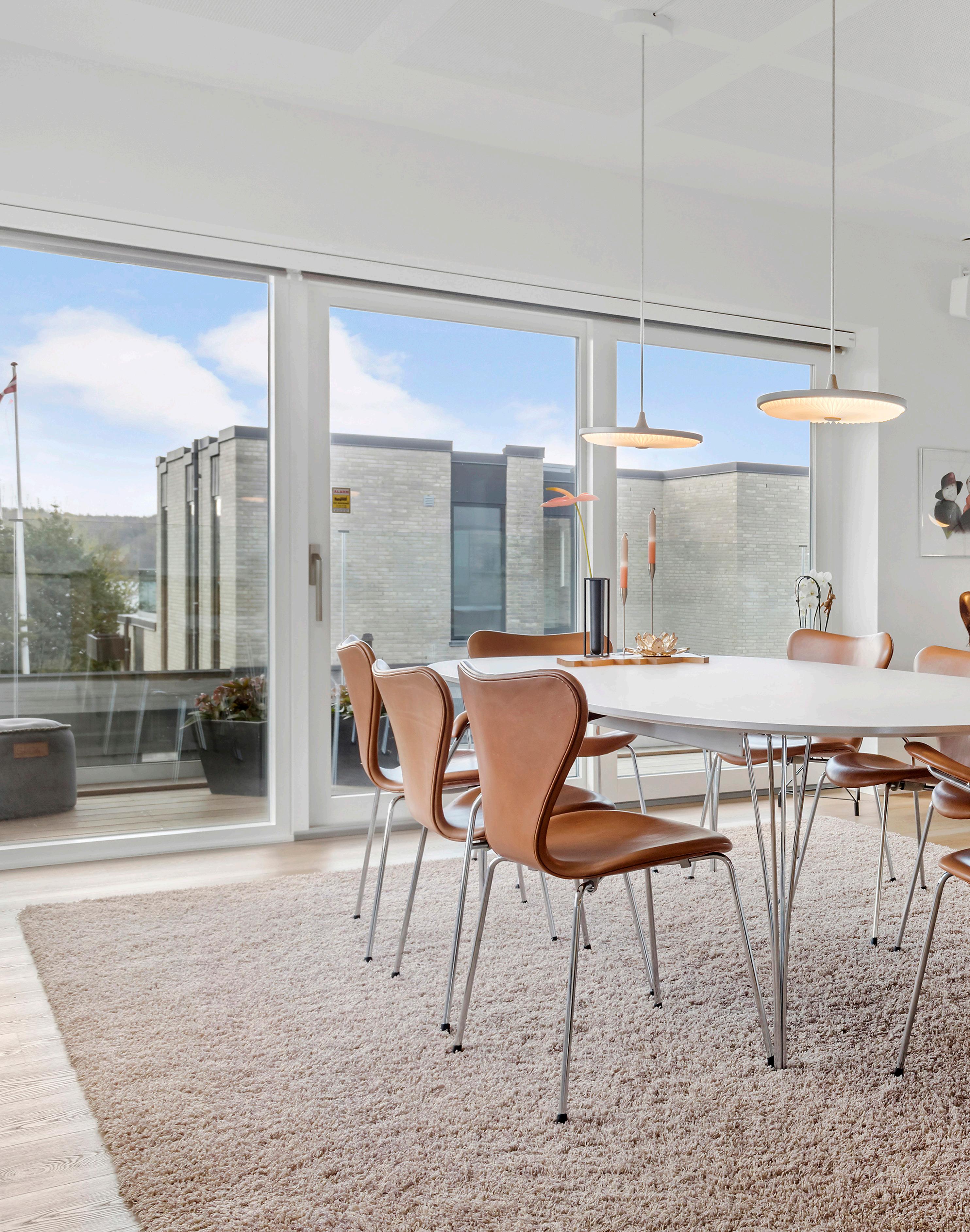 Det smukke køkken med de flotte detaljer og luksuriøse Dekton-bordplade glider over i et charmerende alrum, hvor fjordudsigten, spiller en central rolle.