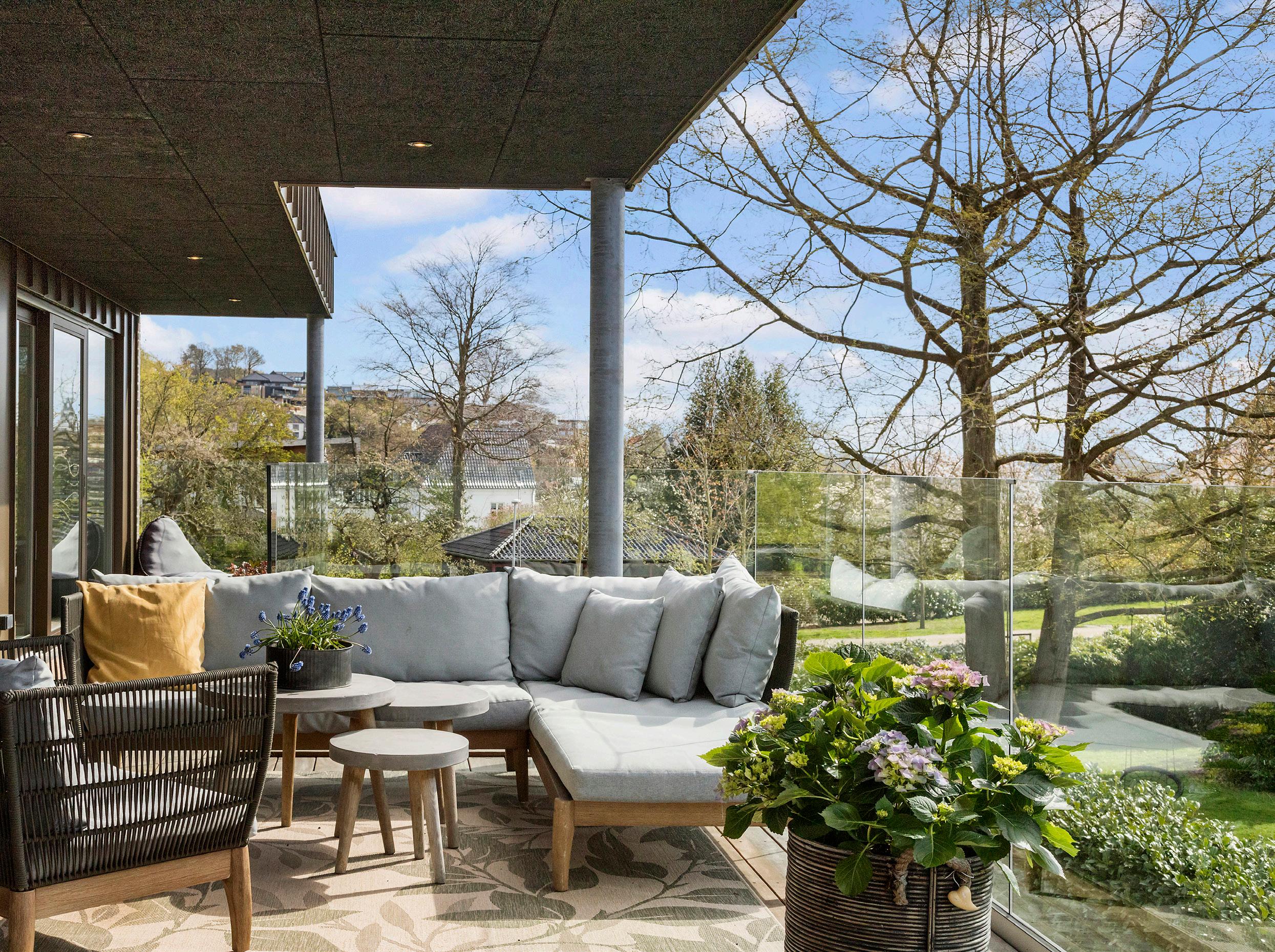 De fjernbetjente solgardiner sørger for at graduere solens stråler efter behov, som dagen skrider frem. Hele den ene væg i stuen kan åbnes op mod terrassen, hvor der er klargjort til at installere varme, så sæsonerne kan forlænges yderligere. Du får med andre ord årstidernes skiften helt inde under huden fra alle rummene på førstesalen, men især i stuen. Den indbyder ganske enkelt til ro og fordybelse.