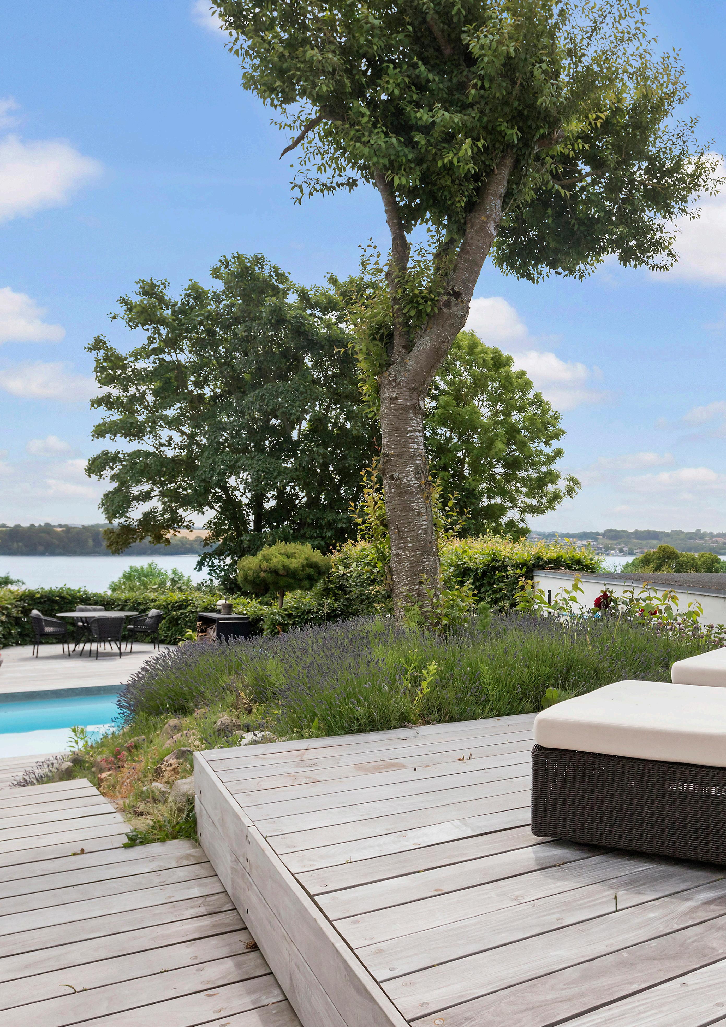 Foruden de grønne anlæg, er der ligeledes store fantastiske terrasser i forskellige niveauer, som sikrer, at du kan finde en solplads, fra solen står op, til den går ned igen. Derudover har du udekøkken på den store terrasse med pool. Poolen er installeret med professionelt renseanlæg samt ekstern luft til vand pumpe. Den har en dybde på 1,5 meter på det dybeste sted og 0,95 meter på det laveste. Der er endvidere både poollys og trappe for dem, der ønsker at gå stille og roligt i vandet eller måske endda bare sidde på trappen med fødderne i vandet og nyde udsigten med et godt glas vin i hånden. – så her har du altså alle forudsætninger opfyldt for massevis af timers hygge på de fantastiske terrasser med panoramaudsigt og liv på Fjorden, så langt øjet rækker.